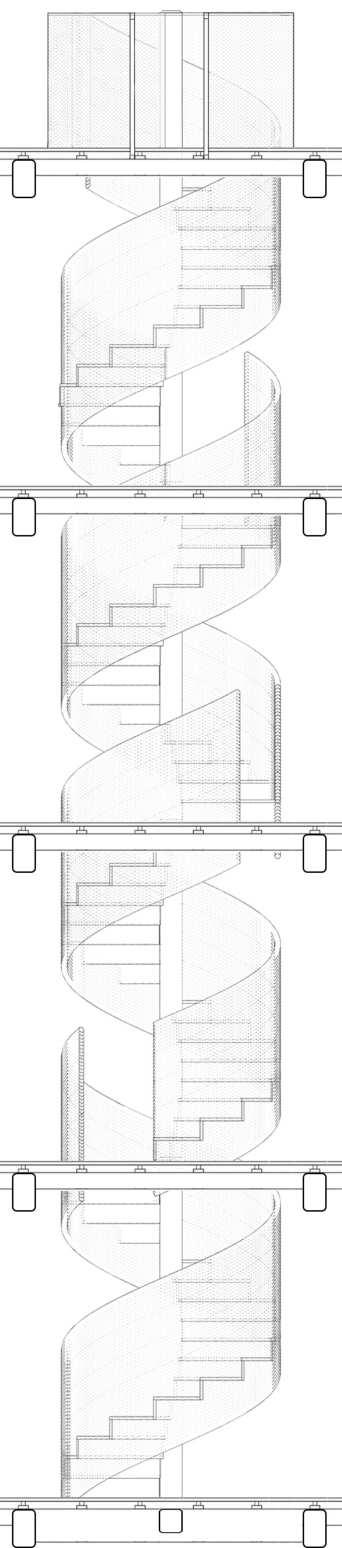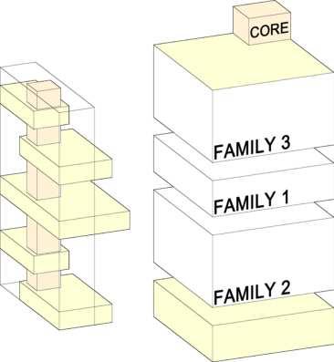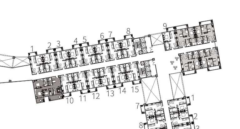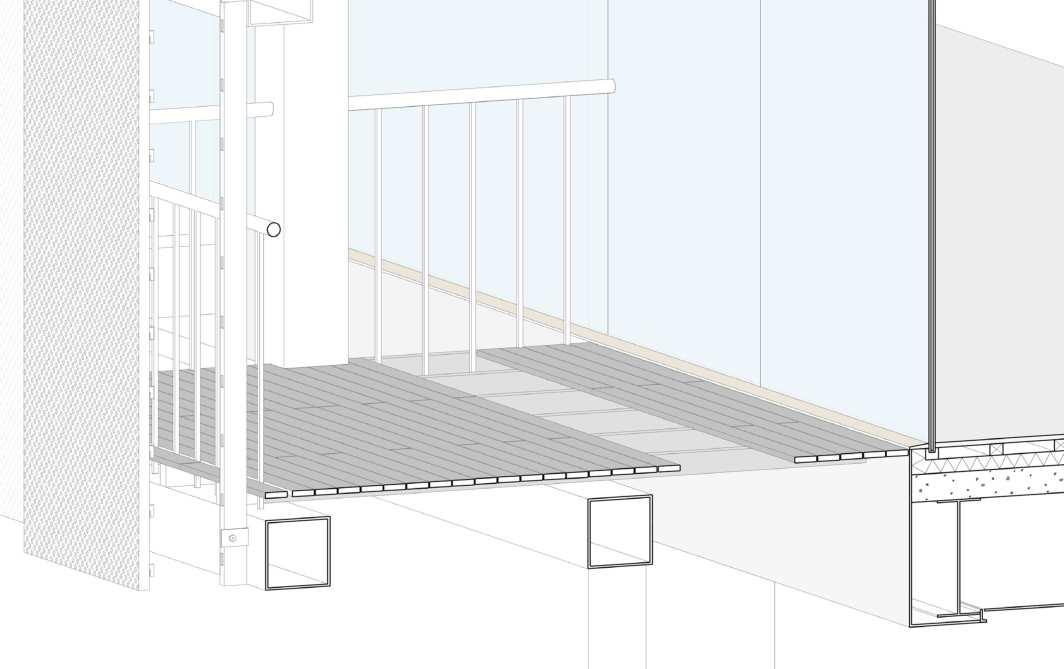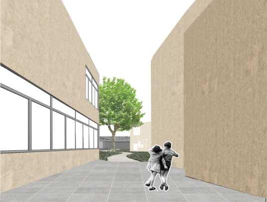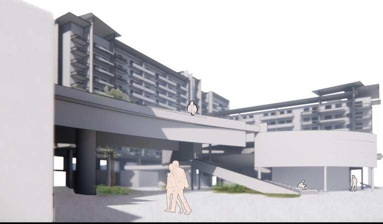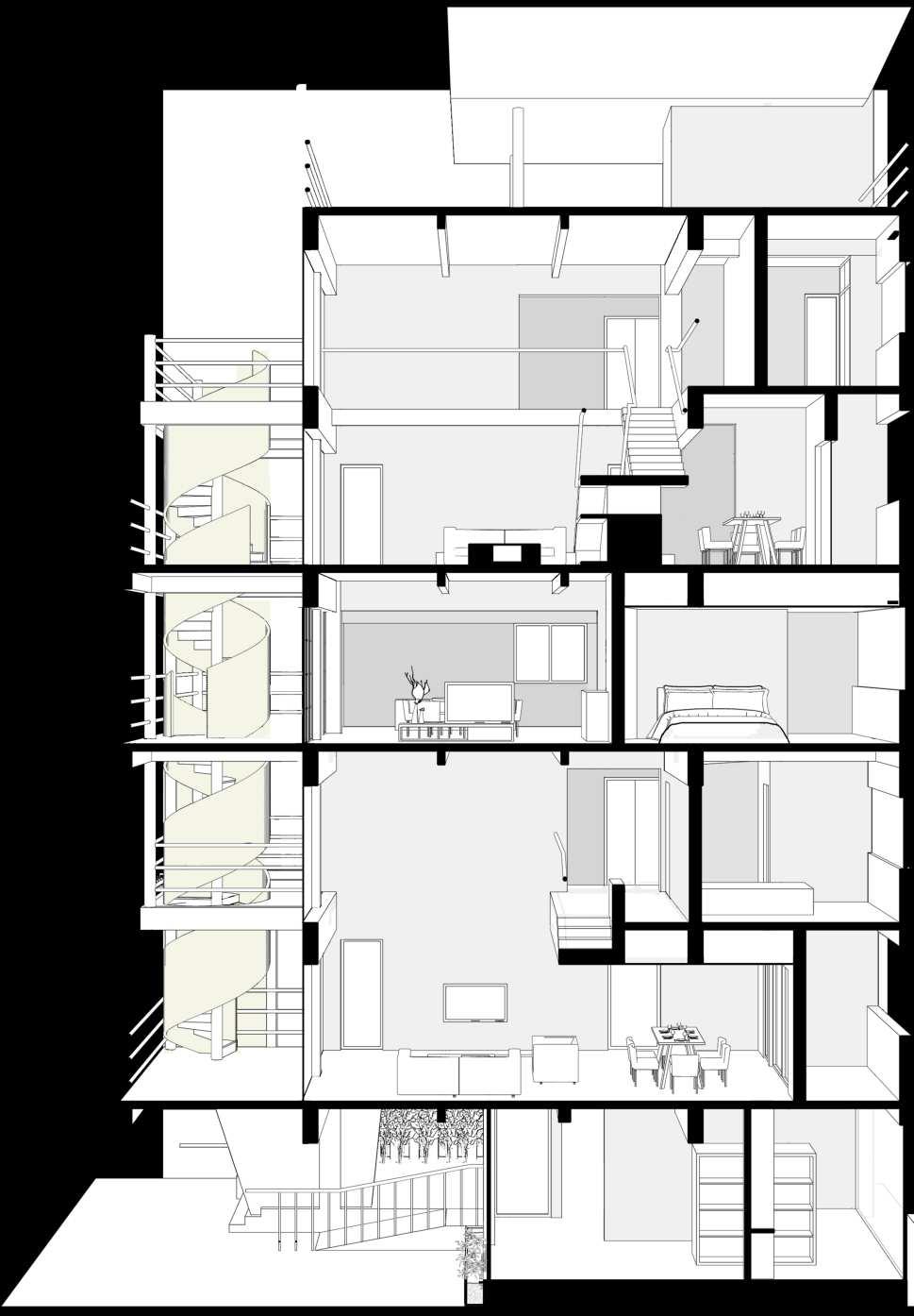 一系列过渡公共阳台连接每个家庭街区。 它们也成为家庭之间流动的边界。通过这 种策略,我试图平衡现代住宅对隐私的需 求与这个家庭在旧庭院中共同生活的传统。