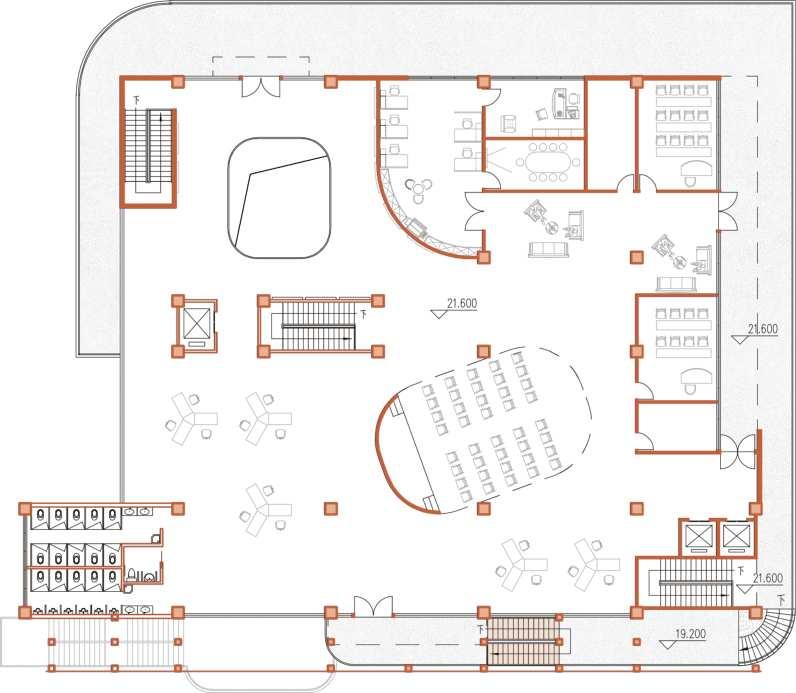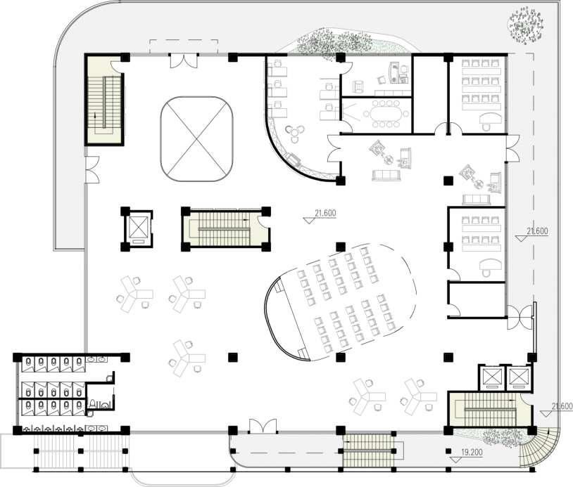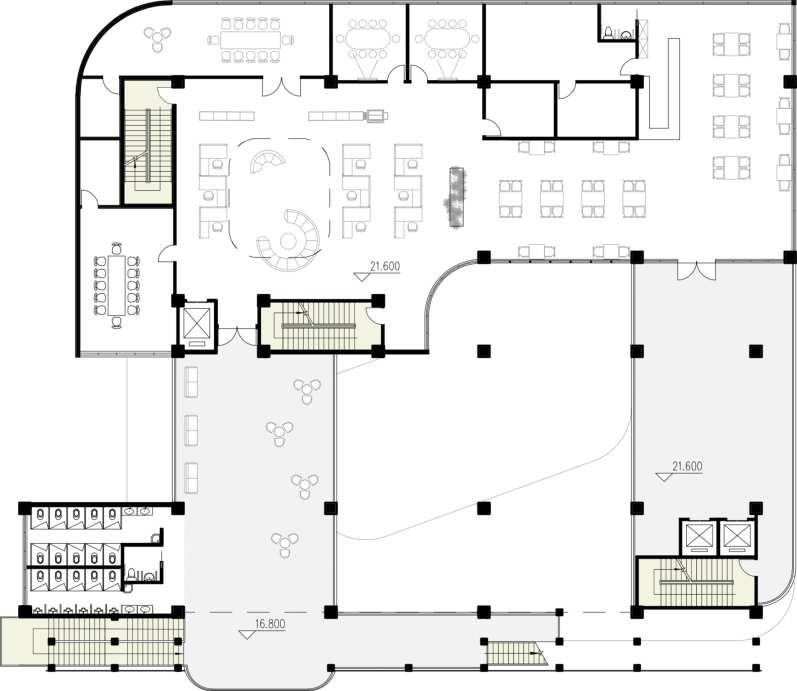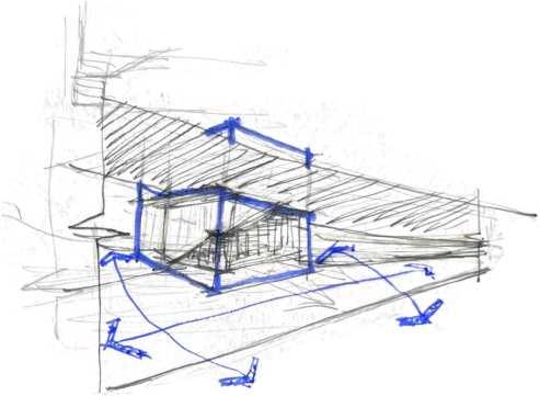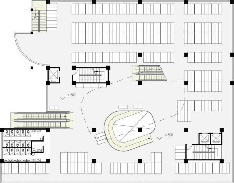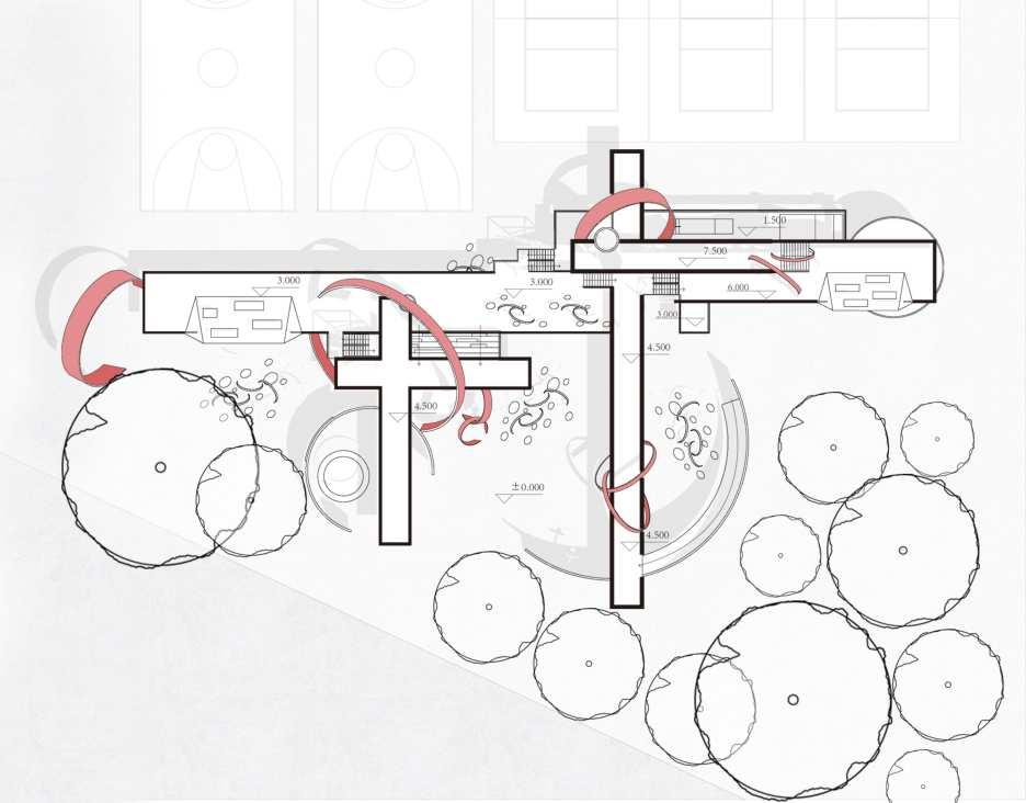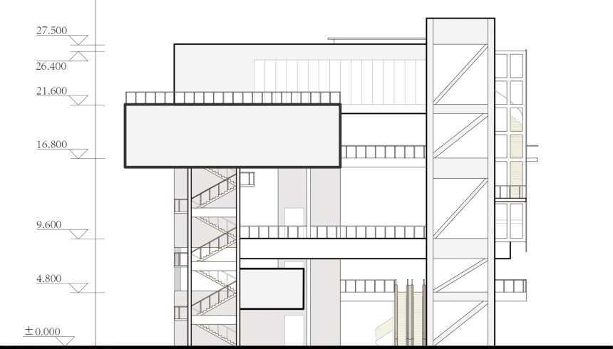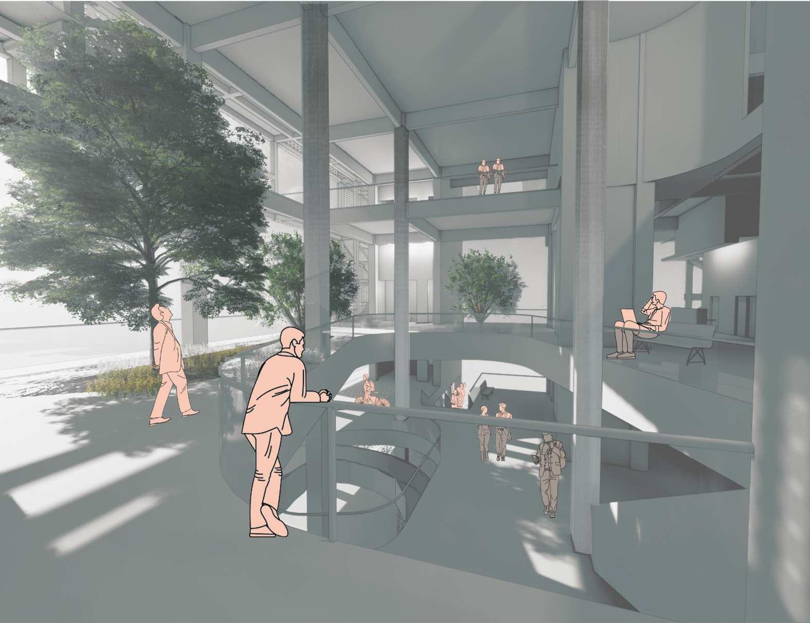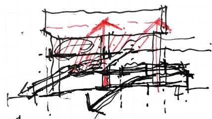 我将需要封闭空间的功能抬升,解放较低的 楼层,为来往的人流创造了一个开放而温馨 的公共空间。