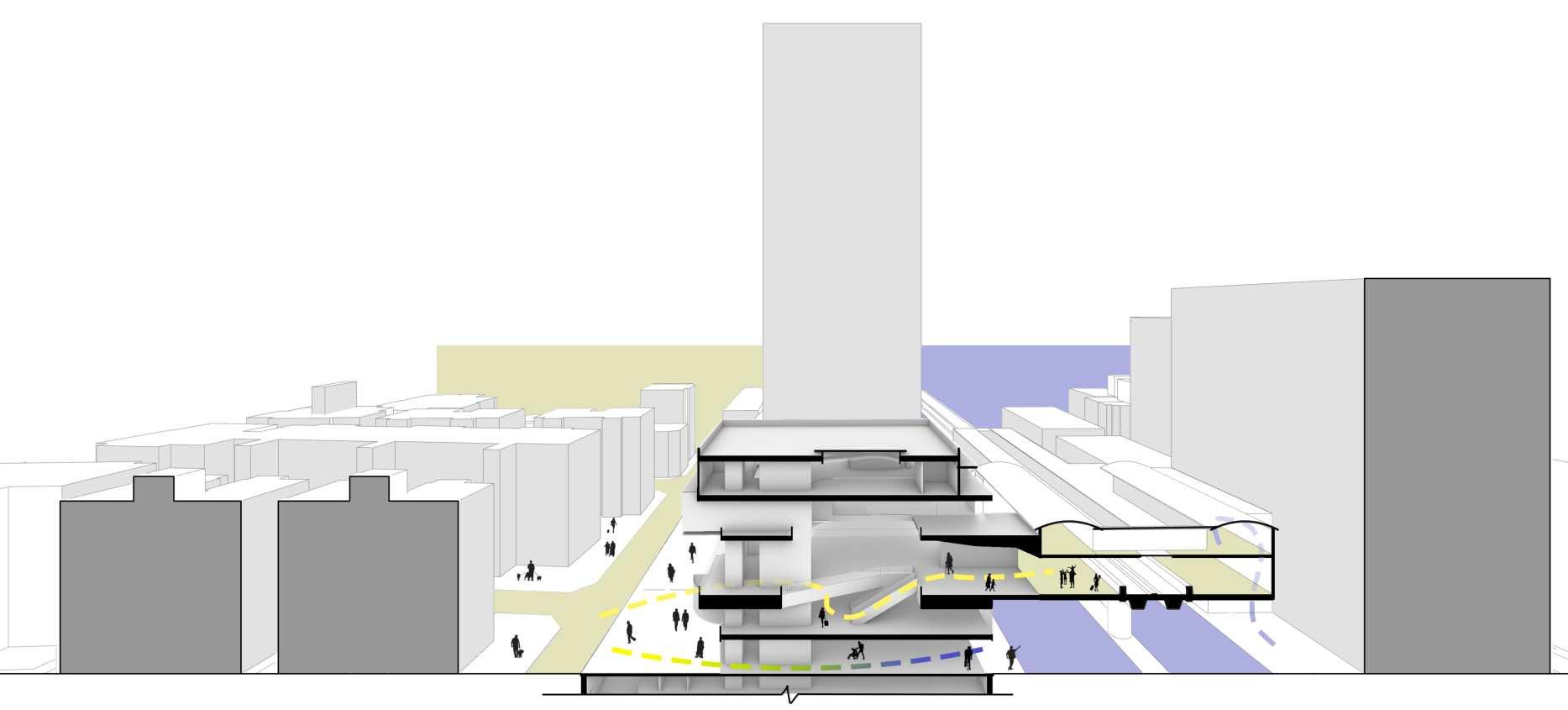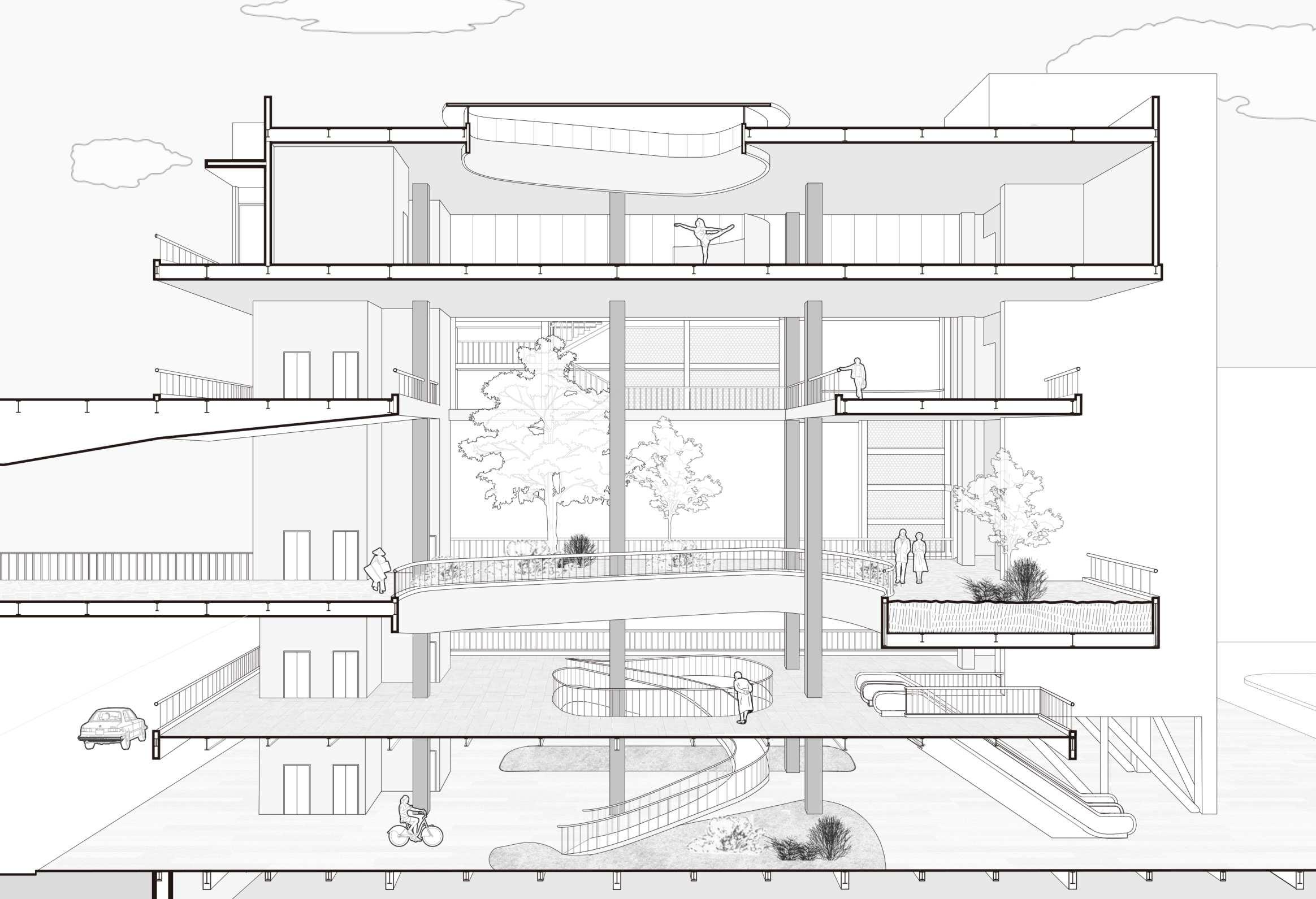 作为出站乘客进入社区的门户,内部的大空间创 造了一个温馨而互动的空间,促进了居民和游客 之间的联系。设计也通过游牧式的平面布局策略 来消除边界。