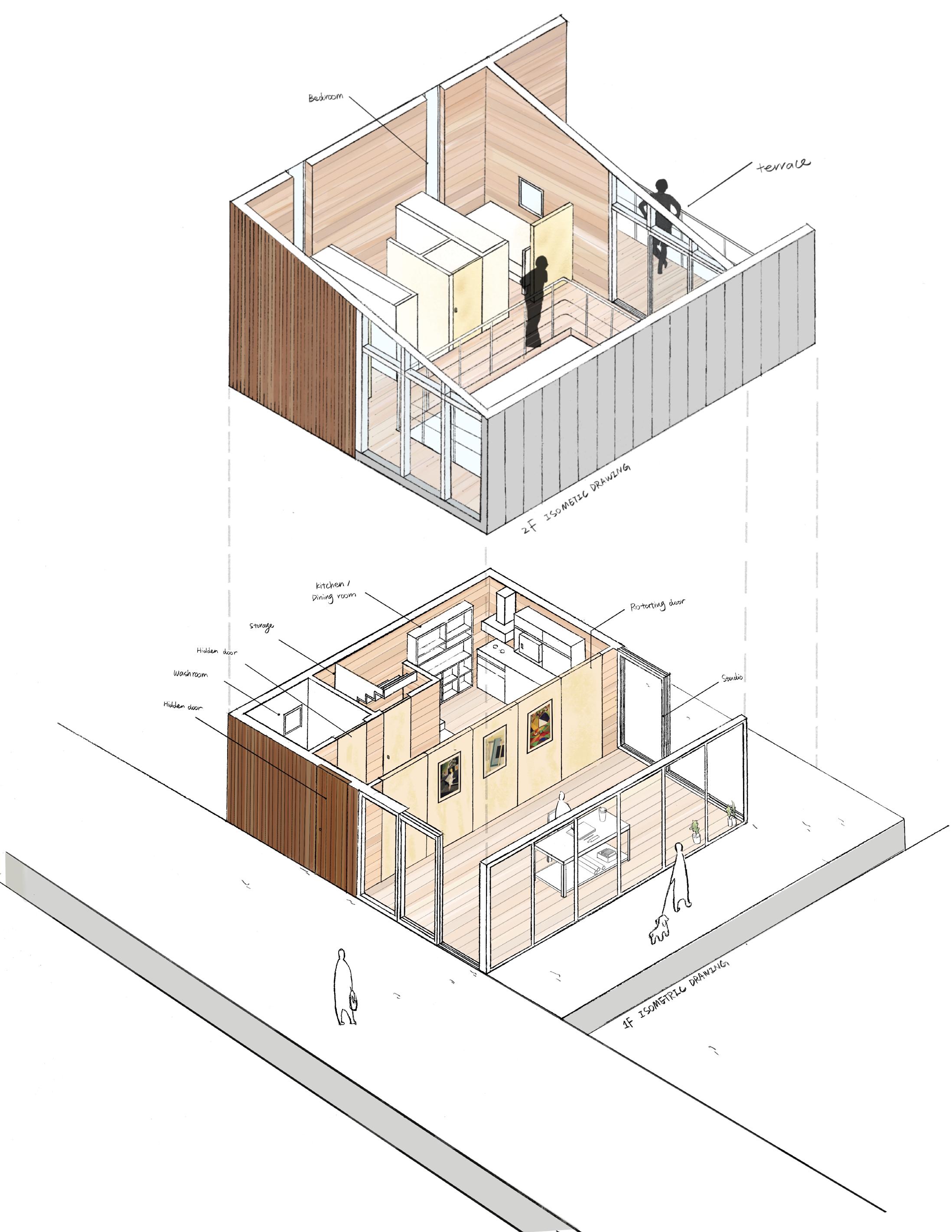 The project is to design a floating, live and work artist house along the Clock Tower Pier in the Old Port of Montreal. It was inspired by the practice from the previous phase; my group wants our design to convey the notion of Solid and Void. The design is imagined to accommodate two artists during the annual Summer Festival of Art.