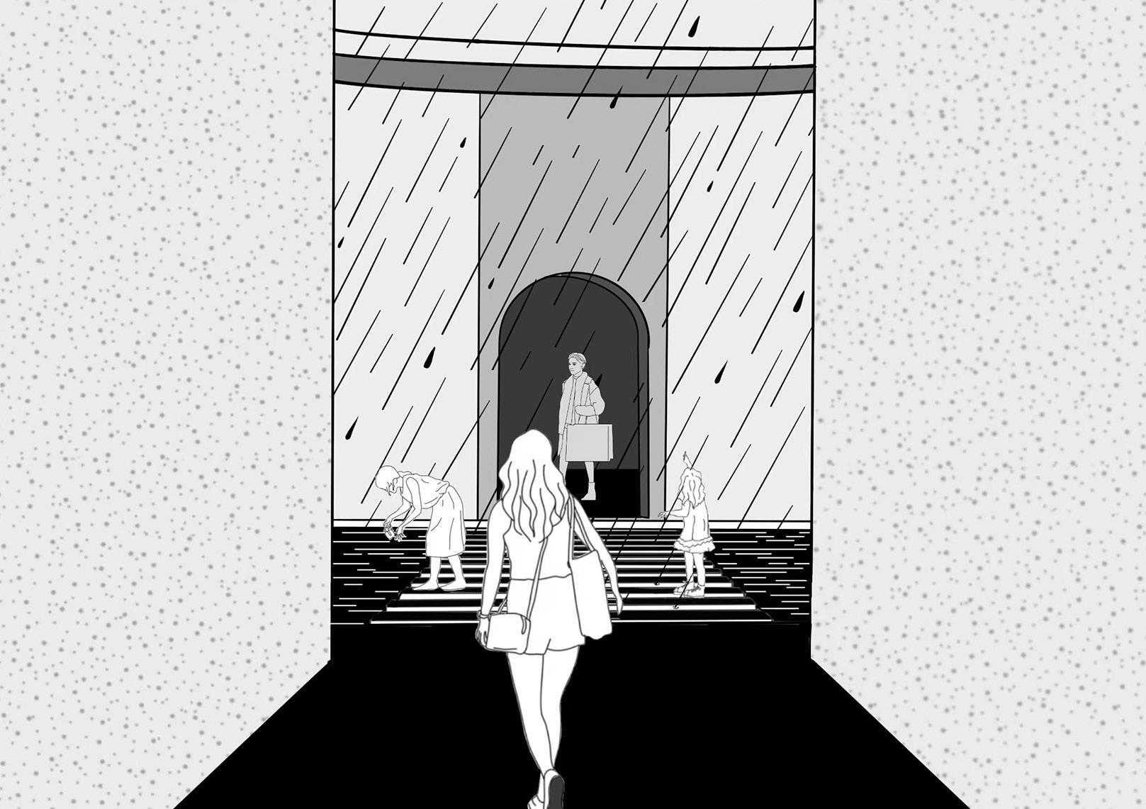 When the rainy season approaches, the rainwater collection system of the building and the water channel in the walls are gathering raindrops. The rain becomes a stream, spiralling into the building, along the designed path, begins its journey in the building. The water storage walls and cisterns are designed to accommodate