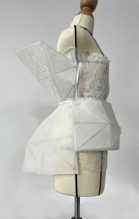 The team first used CLO3D for paneling and styling after conceptualizing the design. The pattern and fabric models were then imported into Rhino and parameterized using Grasshopper to create the digital model. The digital model was then sliced and printed.