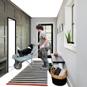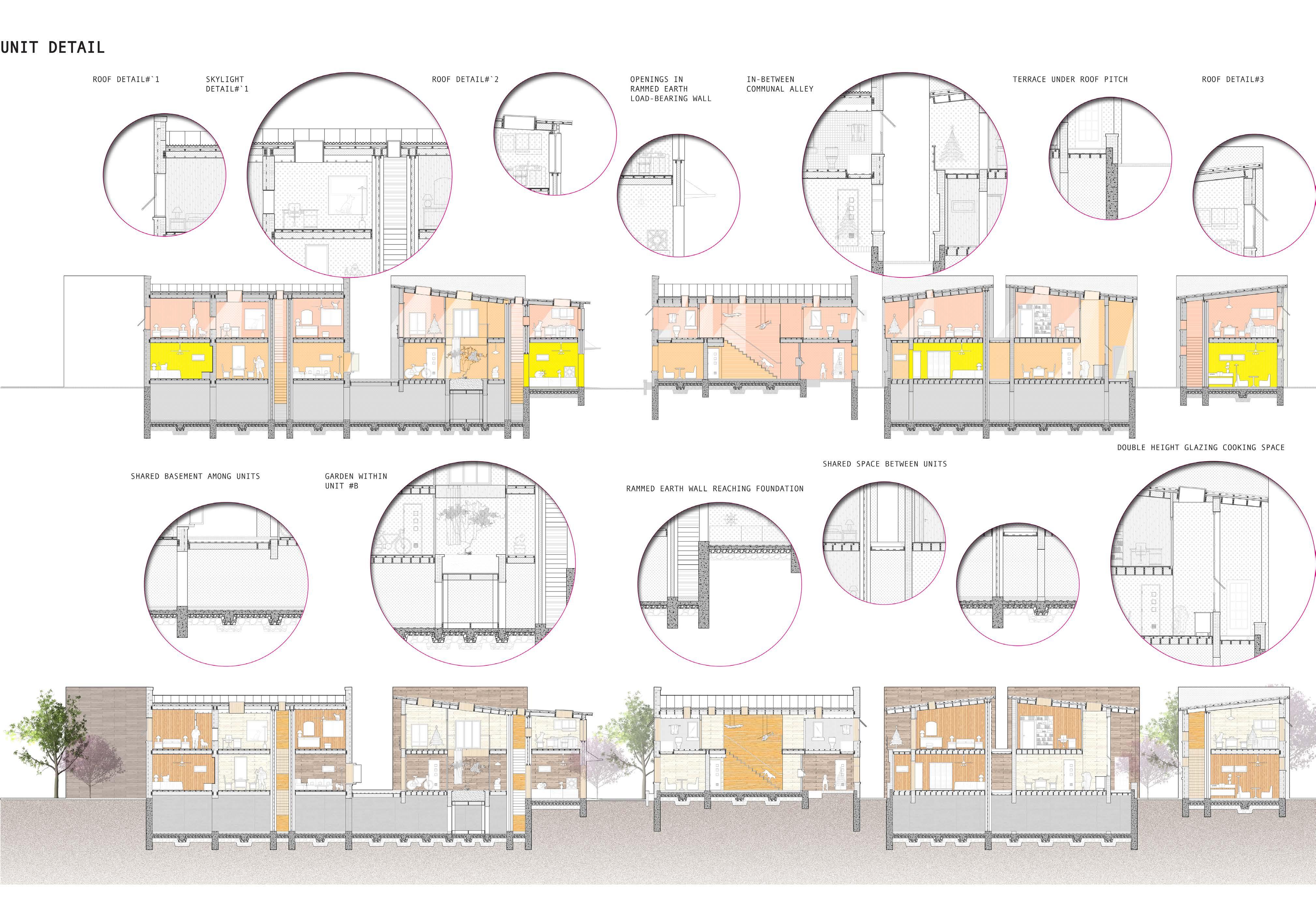The collection of the window, the stair, and the garden are leaders of our uniA space-making. Alexander’s A Pattern language serves as a method to stitch different scaled spaces together and organize space-making as patterns of behavior and design. We made our own patterns and when clustered together, these patterns start to form collaborations of designed spaces. The clusters were then crafted in three unit typologies. These clusters were implemented at different scales for different unit capacities. Some notable design decisions were made, some of which include, raising the first floor off of grade, double height interior spaces, and shared basements. The first floor of the unit is raised 2 feet above ground level, this creates a separation between people walking outside and the person living inside. In all units, there is a double-height space with a skylight above, this allows for an open feeling of space with ample natural lighting. Lastly, underneath the units are space basements separated by doors that can be used as storage, laundry, and hangout space. *