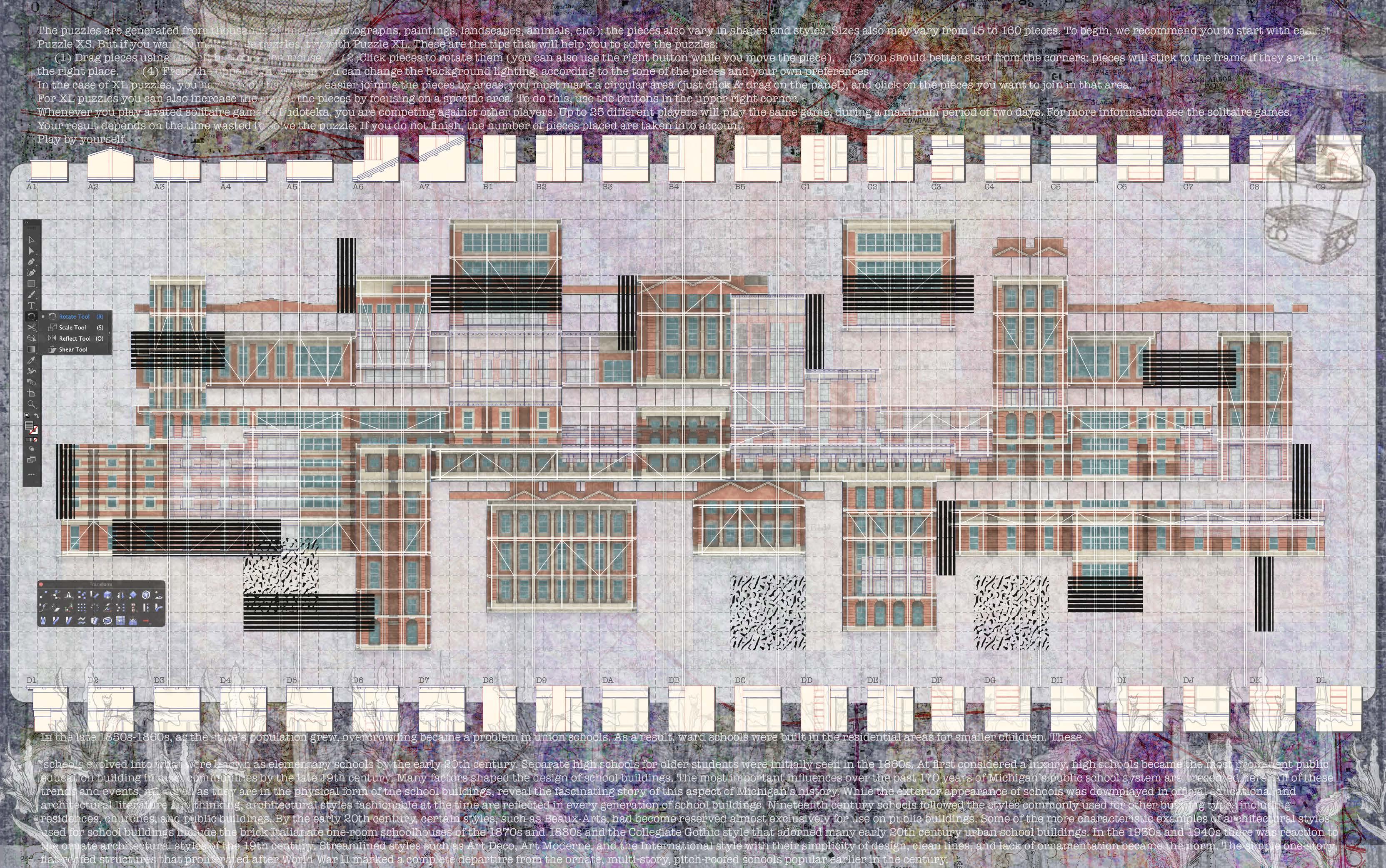 The primary objective of this project is to develop a new approach to knowledge distribution as a supplement to local education. Gaming with curated architectural fragments of Ann Arbor’s public high schools and the surrounding neighborhoods, the library is conceptualized as a new and alternative library type that displays and provides access to explicit and tacit forms of knowledge construction. Centripetal collection and centrifugal distribution are structured as part of the proposal, as well as a construction-like scene that implicates the incomplete, indeterminate, and emerging situation of the library.