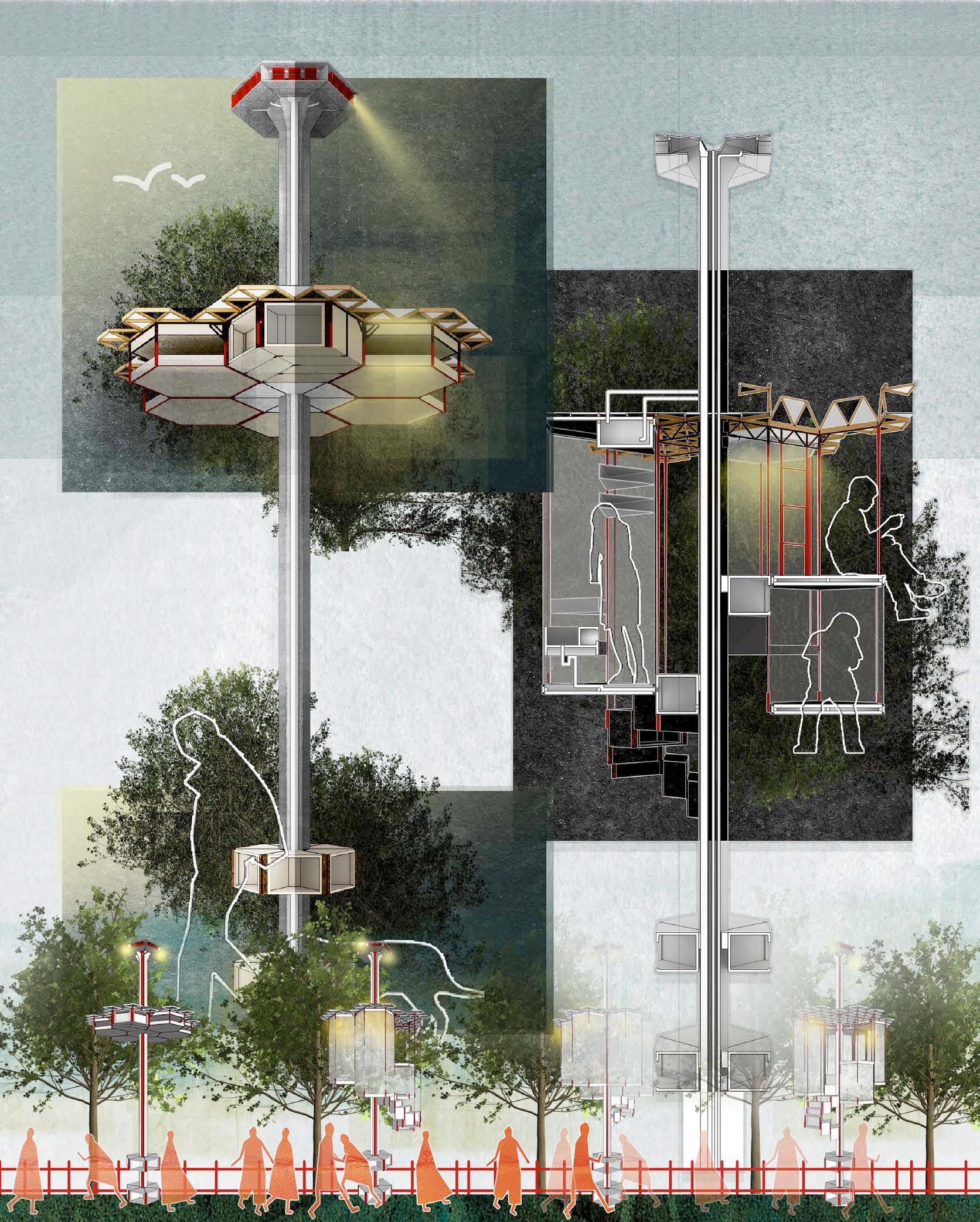 • Projectors are attached on the poles to work as city furnitures and emergency shelters for both human and non-human species.