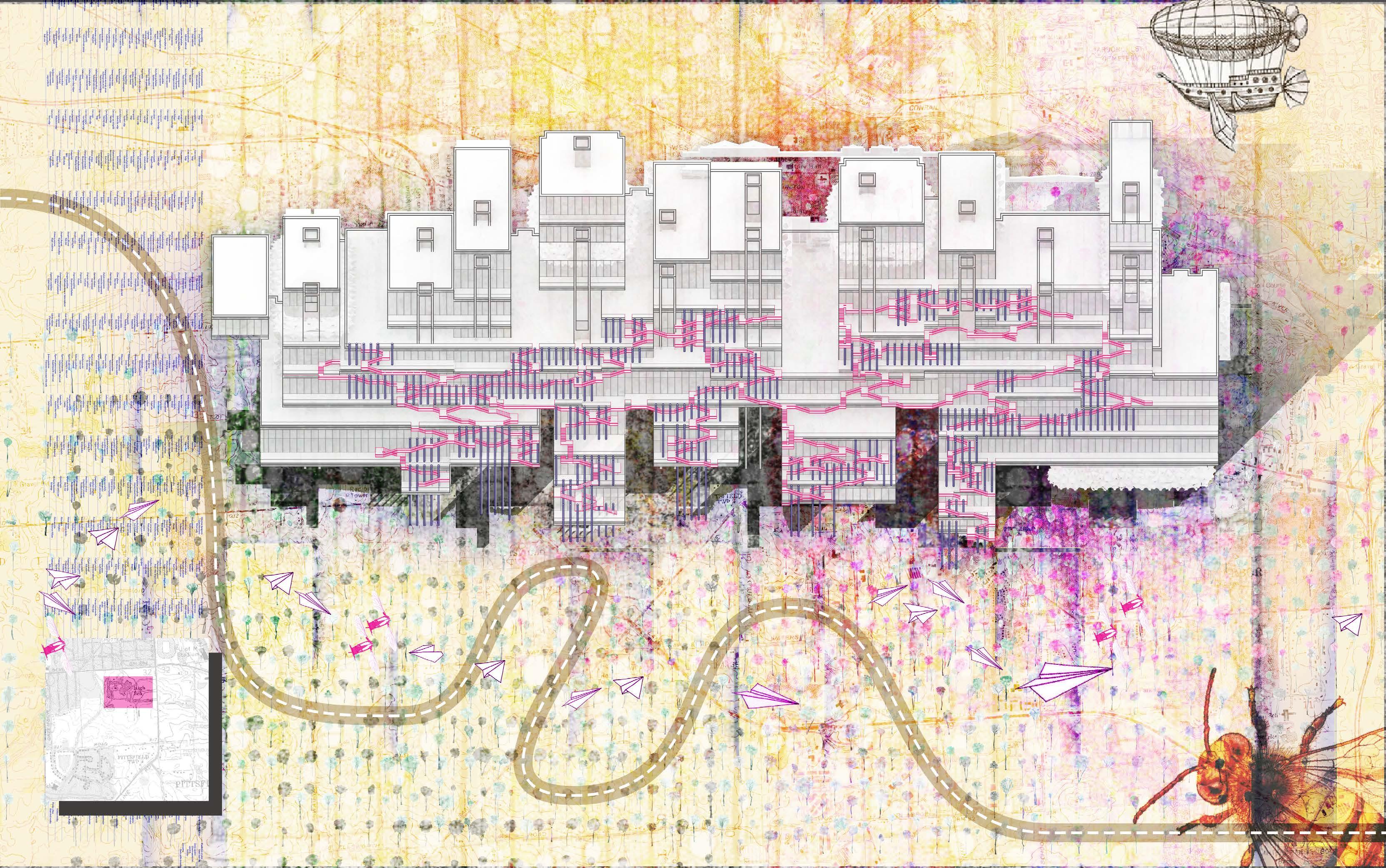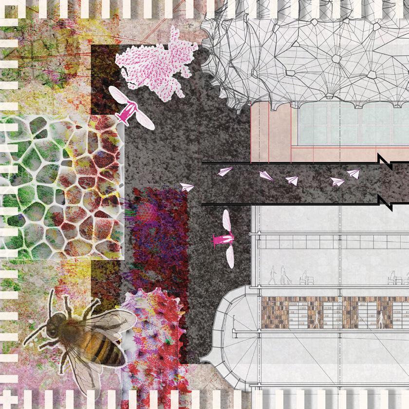 More than Honey also reflects the struggle of encompassing power, economics, culture, and nature within the scale of a building. The honeybees and the three substitutes (paper bees, mechanical bees and Hindenburg bees) are initiated in the project and act as: daily producers of honey, essential pollinators for fertilization and blossoming, ambassadors for knowledge, sensors for weather and active air writers for events. The relation between wildlife and human beings is discussed and a range of issues are engaged productively, such as: global population decline of pollinators (e.g. honeybee), regional biodiversity and issues surrounding social and environmental sustainability in relation to architectural meaning. These ambitions, both conceptual and spatial, enable a more sensitive, nurturing and benevolent world.*