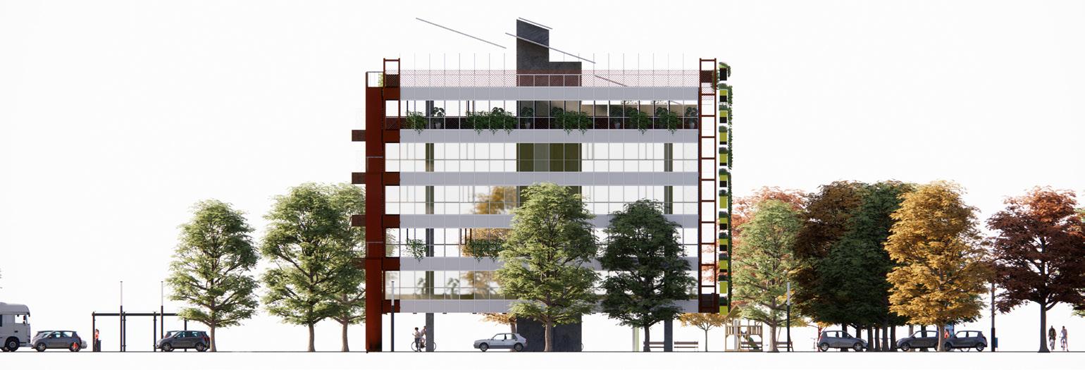 The project is located between the East Jefferson Avenue and Larnet Street, south to the Lafayette Park designed by Mies Van der Rohe in 50s. The building is oriented to a southwest-northeast axis. The southwest facade is facing a park and is proposed to have a “vertical garden”. The northwest facade is facing the residential tower across the street and a dynamic balcony system would be implemented to reflect the urban soul of the site. The northeast facade is facing a parking lot and a double facade with a stair system would be set here as to increase a sense of privacy and joyfulness for the old infrucstructure. The southeast facade is facing East Hefferson Avenue. A Brise soleil system is proposed to align with the other business buildings along the avenue. In addition to that, I was thinking about installing a PV solar system on top of the roof. However, I later realized the energy generated was so little compared with the energy consumption of the whole building system because (1) the weather in Detroit is not so nice; (2) the roof area is limited; (3) running a building is so expansive.