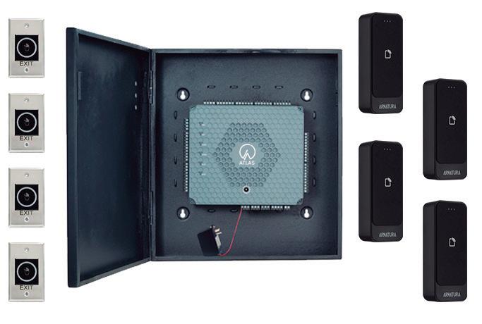 Atlas 460, 4 lectores EP10, 4 pulsadores, 1 armario con fuente de alimentación.