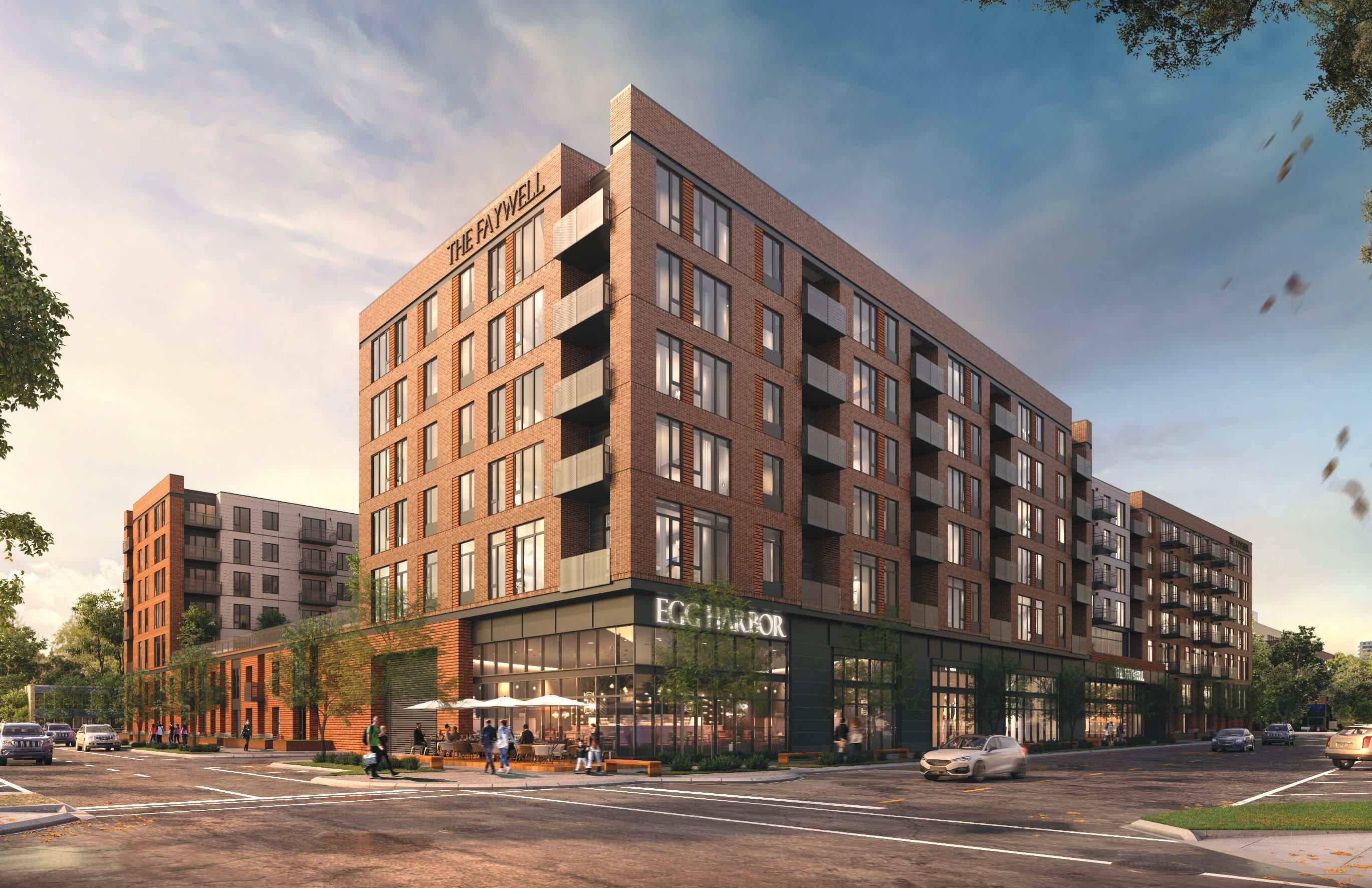 The Faywell is a 562,000-square-foot, $110 million market-rate housing development featuring 334 residential units. The project is designed as a full brick podium structure with a two-story parking garage and ground-floor commercial space, creating a vibrant mixed-use environment. Surrounding the main building are two-story walk-up units, providing a diverse range of housing options.