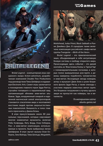 Motörhead, Judas Priest, Black Sabbath и Ронни Джеймса Дио. В саундтрек также включена композиция российской симфо-метал группы Tvangeste – «Birth of the Hero». Brutal Legend – это приключенческий экшн, объединяющий в себе интуитивную боевую систему и свободу открытого мира. Происходящие здесь события – это дикий коктейль из 'Властелина Колец' и 'Spinal Tap' с головокружительными погонями, в которых полно вымышленных рок-групп, а демоны намерены поработить человечество и хеви-метал. Восходящая звезда комедии, актер и музыкант Джек Блек в роли безумного фаната Эдди Ригза, а также эпизоды с участием лидеров известных метал групп. Это безумное погружение в пучину адского зверя не пропустят как геймеры, так и металлисты. По материалам сайта: ubuntu-games.net