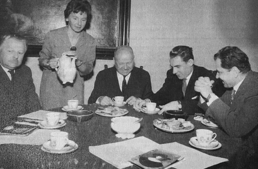 Od lewej: prof. Antoni Łyżwański, wiceszef wydziału kultury Komitetu Centralnego PZPR, Anna Ziomecka, kustosz Muzeum Śląskiego we Wrocławiu, prof. Stanisław Lorenz, dyrektor Muzeum Narodowego w Warszawie, Tadeusz Kaletyn i Mieczysław Ptaśnik, dyrektor Zarządu Muzeów i Ochrony Zabytków podczas konferencji we Wrocławiu w 1962 r.