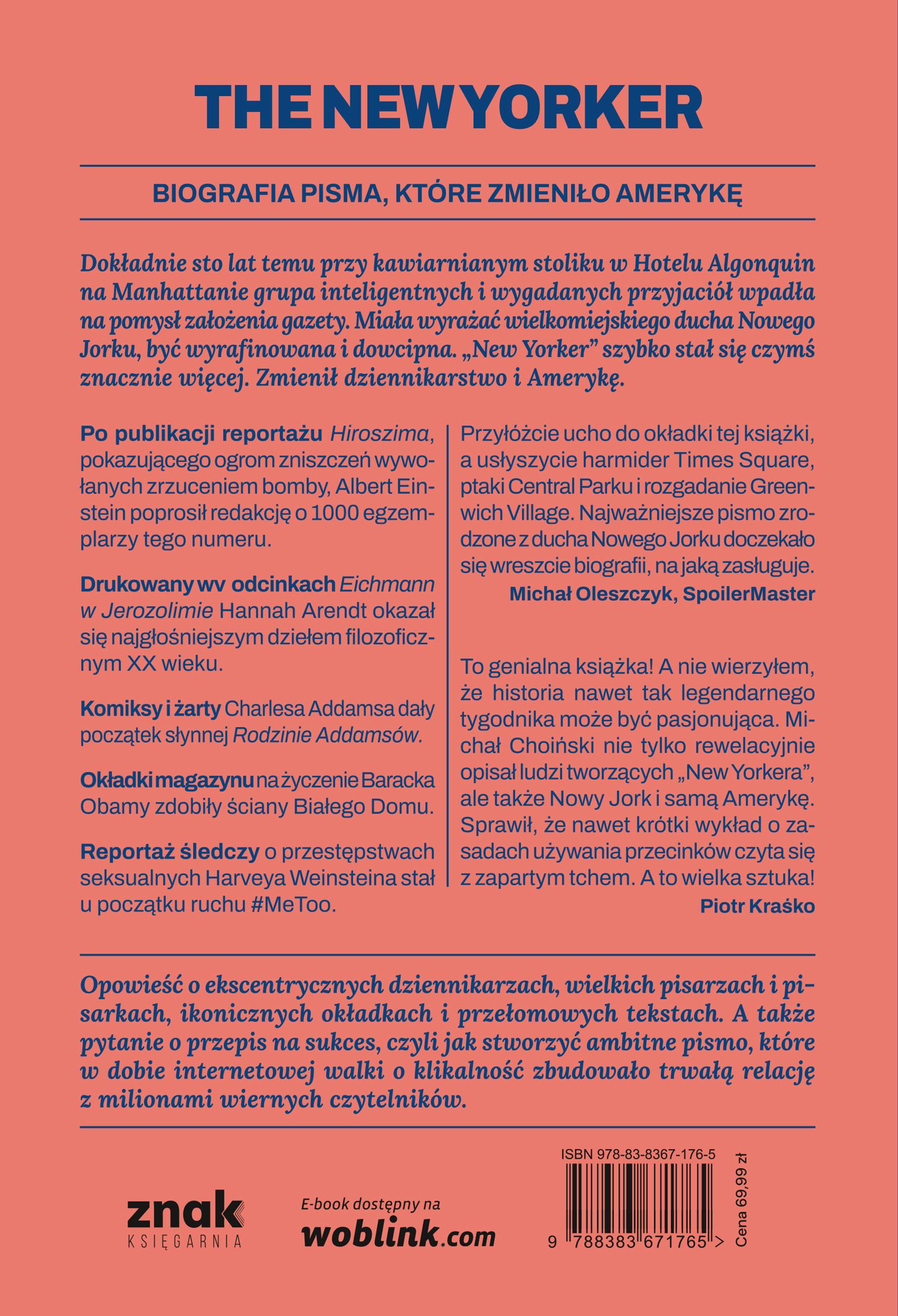 Zresztą każdemu i każdej z nas – choć nie zawsze zdajemy sobie z tego sprawę – zdarza się trafić na coś związanego z „New Yorkerem”. Rodzina Addamsów, Z zimną krwią Trumana Capote’a, Hiroshima Herseya, reportaże na temat skandali seksualnych Harveya Weinsteina czy noszona na ramieniu torba z logotypem magazynu. Tylko jakoś może nie zawsze dociera do nas, że stoi za tym jeden tytuł. Kiedy zaczynałem pracę nad tą książką, miałem mnóstwo pytań, ale jedno szczególnie nie dawało mi spokoju: jak to wszystko mogło się udać?