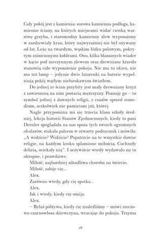 Cały pokój jest z kamienia: surowa kamienna podłoga, kamienne ściany, na których miejscami widać cienką warstwę grzyba, i staromodny kamienny zlew wyposażony w zardzewiały kran, który najwyraźniej nie był używany od lat. Leżę na twardym, wąskim łóżku polowym, pokrytym zniszczonymi kołdrami. Ono, kilka blaszanych wiader w kącie pod nieczynnym zlewem oraz drewniane krzesło stanowią całe wyposażenie pokoju. Nie ma tu okien, nie ma też lamp – jedynie dwie latarenki na baterie wypełniają pokój wątłym niebieskawym światłem. Do jednej ze ścian przybity jest mały drewniany krzyż z zawieszoną na nim postacią mężczyzny. Poznaję go – to symbol jednej z dawnych religii, z czasów sprzed remedium, aczkolwiek nie pamiętam już, której. Nagle przypomina mi się trzecia klasa szkoły średniej, lekcja historii Stanów Zjednoczonych, kiedy to pani Dernler spoglądała na nas spoza tych swoich ogromnych okularów, stukała palcem w otwarty podręcznik i mówiła: „A widzicie? Widzicie? Popatrzcie na te wszystkie dawne religie, na każdym kroku splamione miłością. Cuchnęły delirią, ociekały nią”. I oczywiście wtedy wydawało się to okropne, i prawdziwe. Miłość, najbardziej zdradliwa choroba na świecie. Miłość, zabije cię... Alex. Zarówno wtedy, gdy cię spotka... Alex. Jak i wtedy, kiedy cię omija. Alex. – Byłaś półżywa, kiedy cię znaleźliśmy – mówi rzeczowo czarnowłosa dziewczyna, wracając do pokoju. Trzyma 16