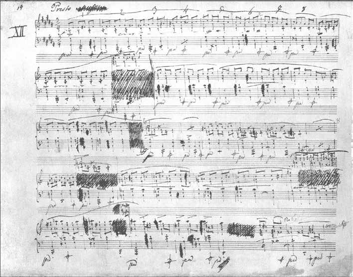 używania rastrala7, którą później została skażona muzykologia). To świat, który zawiera w sobie nieskończoną różnorodność przymiotów – nadzieję, radość, nienawiść, niemoc, cierpienie, nawet rozkosz – wszystkie one przepływają przez pióro, kłębiąc się wrażeniami na zapisanej stronie, i spokojnie czekają na interpretatora. Krótko mówiąc, rękopis jest przedmiotem towarzyskim. Kiedy mierzymy się z nim, konfrontujemy się z częścią biografii, ponieważ obrazy, które przychodzą na myśl, łatwo się nie rozwieją. Dla odizolowanego w swoim pokoju kompozytora, mającego za towarzysza jedynie fortepian (Chopin niezmiennie tworzył przy klawiaturze), nie było niczym niezwykłym spędzić kilka tygodni nad jedną stroną, kreśląc po niej tam i z powrotem i z frustracji łamiąc pióra. Gdy coś poprawiał, upewniał się, że świat zewnętrzny nigdy się nie dowie, jaka była jego pierwsza myśl. Pojedyncze przekreślenie piórem przez urągające ogonki nut mogłoby wystarczyć każdemu innemu kompozytorowi, ale nie Chopinowi. Te kreski musiały zostać przez niego unicestwione.