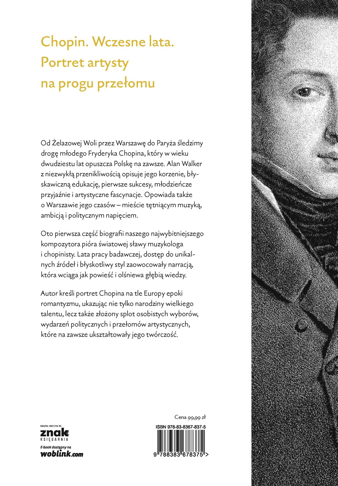 akademickiego programu ~ Fryderyk słucha grających na fortepianie sióstr i odnajduje drogę do klawiatury ~ Mikołaj kupuje fortepian Buchholtza, a Wojciech Żywny zostaje nauczycielem Fryderyka ~ opis ekscentrycznej postaci Żywnego zarysowany na podstawie źródeł historycznych ~ siedmioletni chłopiec publikuje swoją pierwszą kompozycję, Poloneza g-moll ~ po raz pierwszy występuje publicznie 24 lutego 1818 roku, tuż przed ósmymi urodzinami ~ zostaje okrzyknięty „polskim Mozartem” i pojawia się w salonach warszawskiej arystokracji ~ występuje przed carycą odwiedzającą Warszawę i wręcza jej dwa tańce swojej kompozycji ~ zostaje wezwany do pałacu Brühla, by zagrać dla wielkiego księcia Konstantego ~ opis niemal obłąkanego Konstantego ~ przyjaźń Fryderyka z synem wielkiego księcia Pawłem i Alexandrine de Moriolles (Moriolką) ~ sopranistka Angelica Catalani śpiewa w Warszawie, a usłyszawszy grę Fryderyka, obdarowuje go złotym zegarkiem ~ chłopiec koncertuje dla Warszawskiego Towarzystwa Dobroczynności ~ wakacje w Żelazowej Woli, lato 1823 roku we wspomnieniach osiemdziesięcioletniego Antoniego Krysiaka ~ Fryderyk zostaje przyjęty do IV klasy Liceum Warszawskiego ~ opis jego kolegów szkolnych i dyrektora Samuela Bogumiła Lindego ~ uczniowskie psoty ~ Fryderyk kończy rok szkolny ze specjalną nagrodą