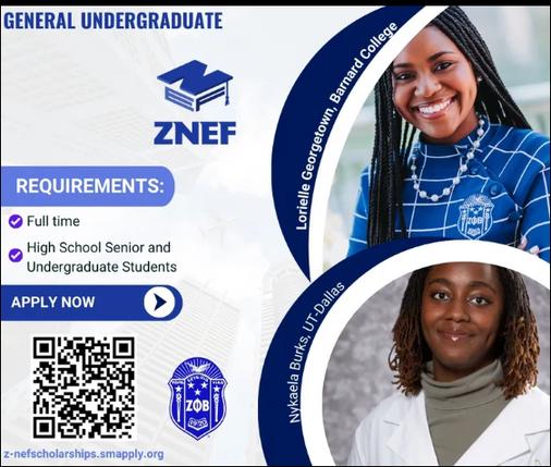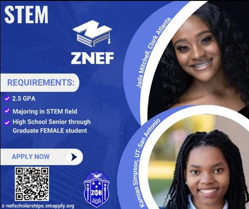 Zeta National Educational Foundation (ZNEF) is proud to offer eight scholarships, one per region, for deserving undergraduate sorors who would like to become Zeta Organizational Leadership (ZOL) certified and advance their Zeta career. One undergraduate scholarship recipient per region will be selected and awarded the cost of undergraduate registration, payable to ZOL on the soror ’ s behalf. The Zeta National Educational Foundation proudly offers a STEM scholarship available to current full-time undergraduate or graduate female STEM students pursuing a degree in science, technology, engineering, and mathematics with a GPA of 2 5 or higher