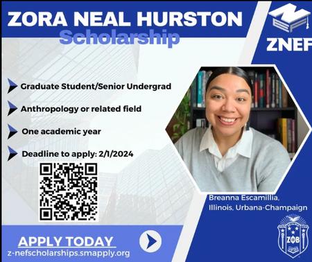 The Zora Neal Hurston Scholarship is available to graduate students pursuing a degree in anthropology or related fields. This scholarship is also available to college (undergraduate) seniors who will matriculate as a full-time student into an accredited graduate anthropology or related degree-granting program in the fall of the award year