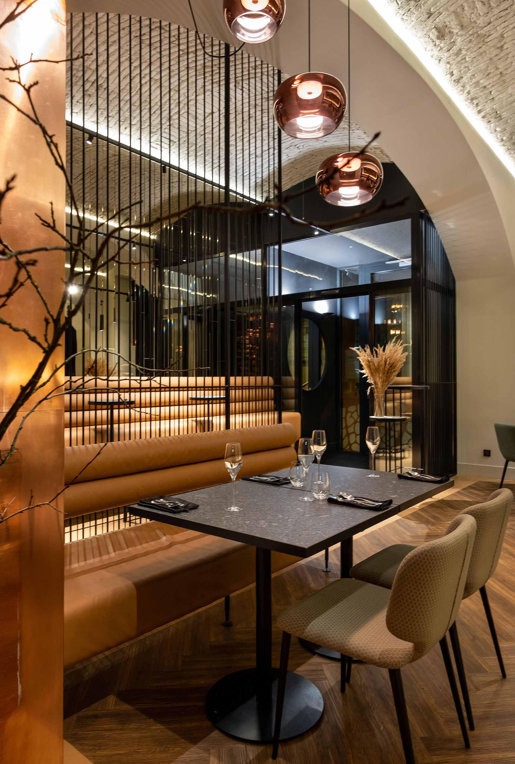Hlavními estetickými prvky jsou měděné portály a průchody, které propojují interiér s exteriérem. Celé barevné ladění se drží v teplé zemité škále, která spolu s lesky měděného obložení a zrcadly vytváří příjemnou a zároveň luxusní atmosféru.