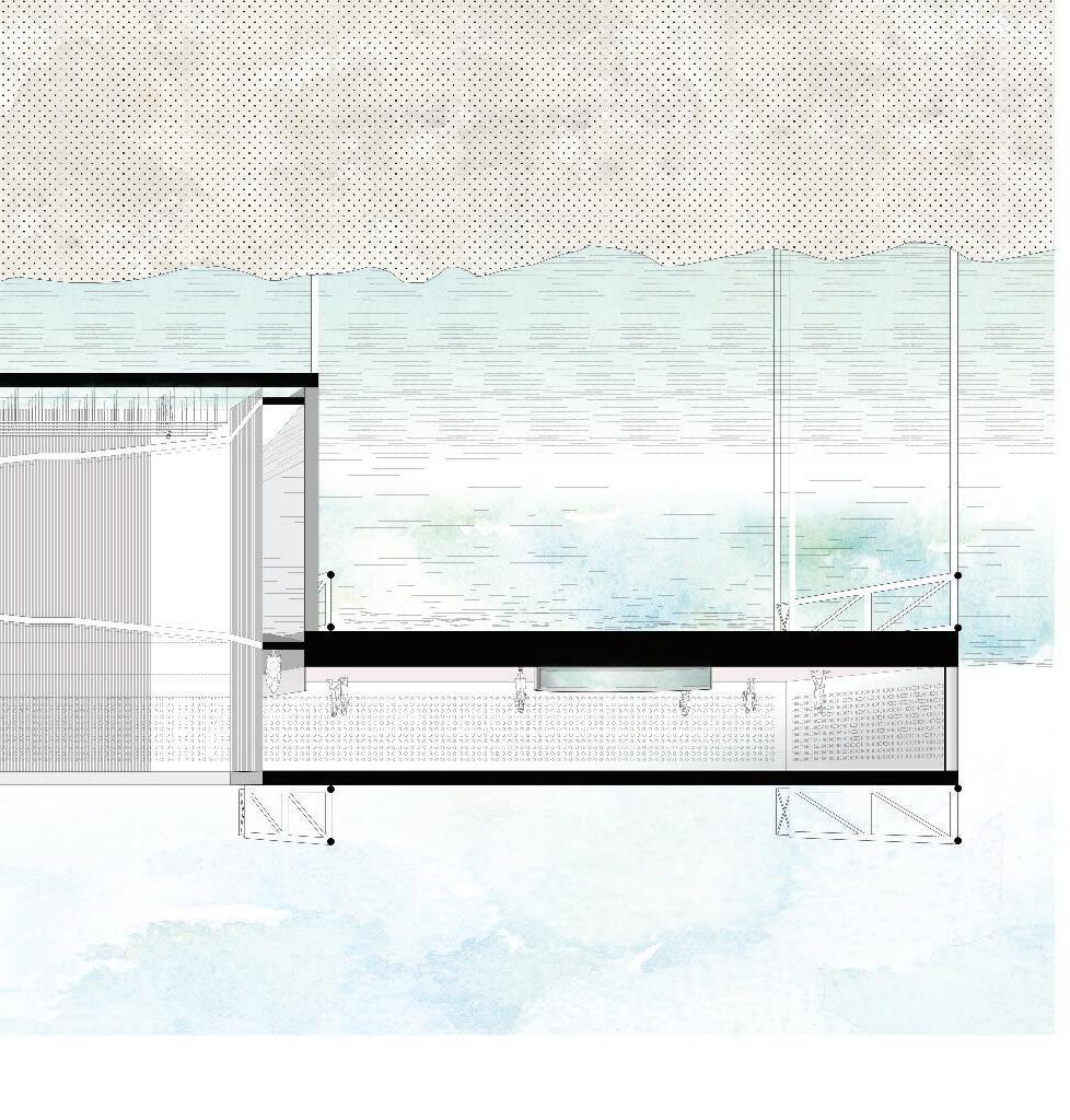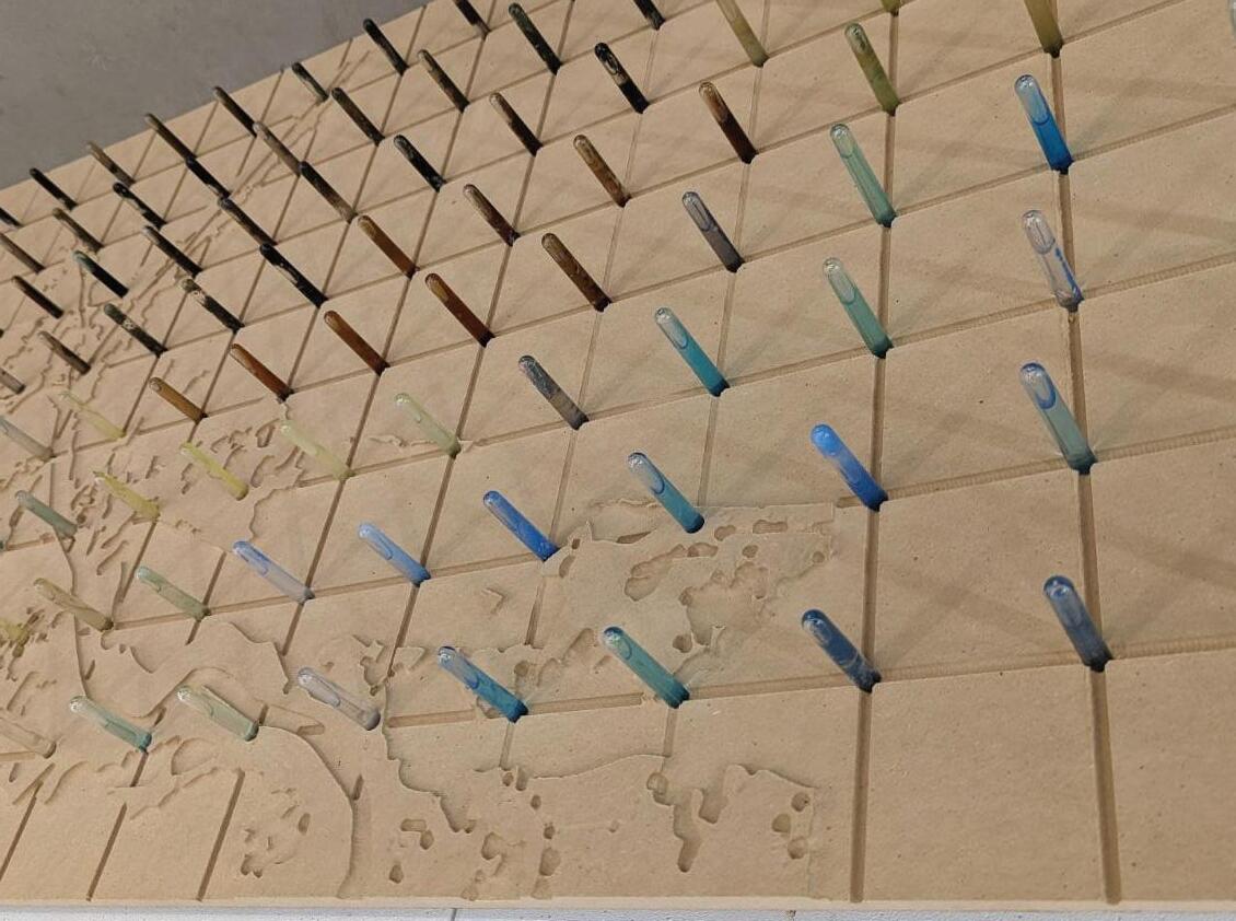 Visitors have the chance to walk down into a controlled tank of water to see up close how oyster farms naturally filter water. The visitors then go back up the ramp to walk above the rest of the oyster farm and back into the main corridor. The two tanks on either side are for the visitors to test the water themselves, and put their test-tube into the walls surrounding the space above.