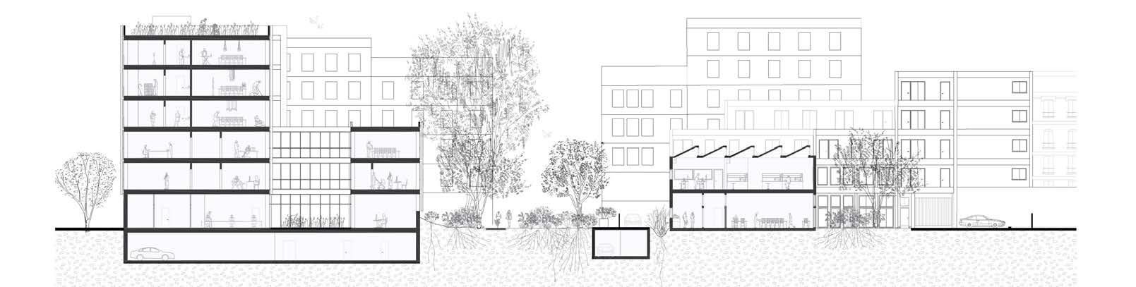 Coupe - Circulations extérieures à travers le parc et souterraines reliant tous les modules