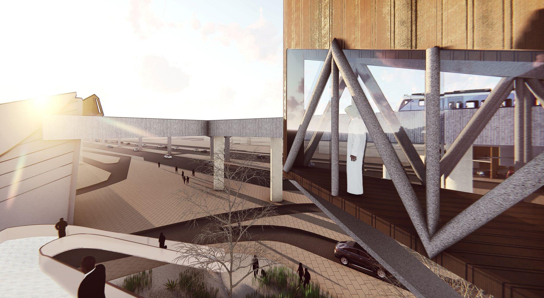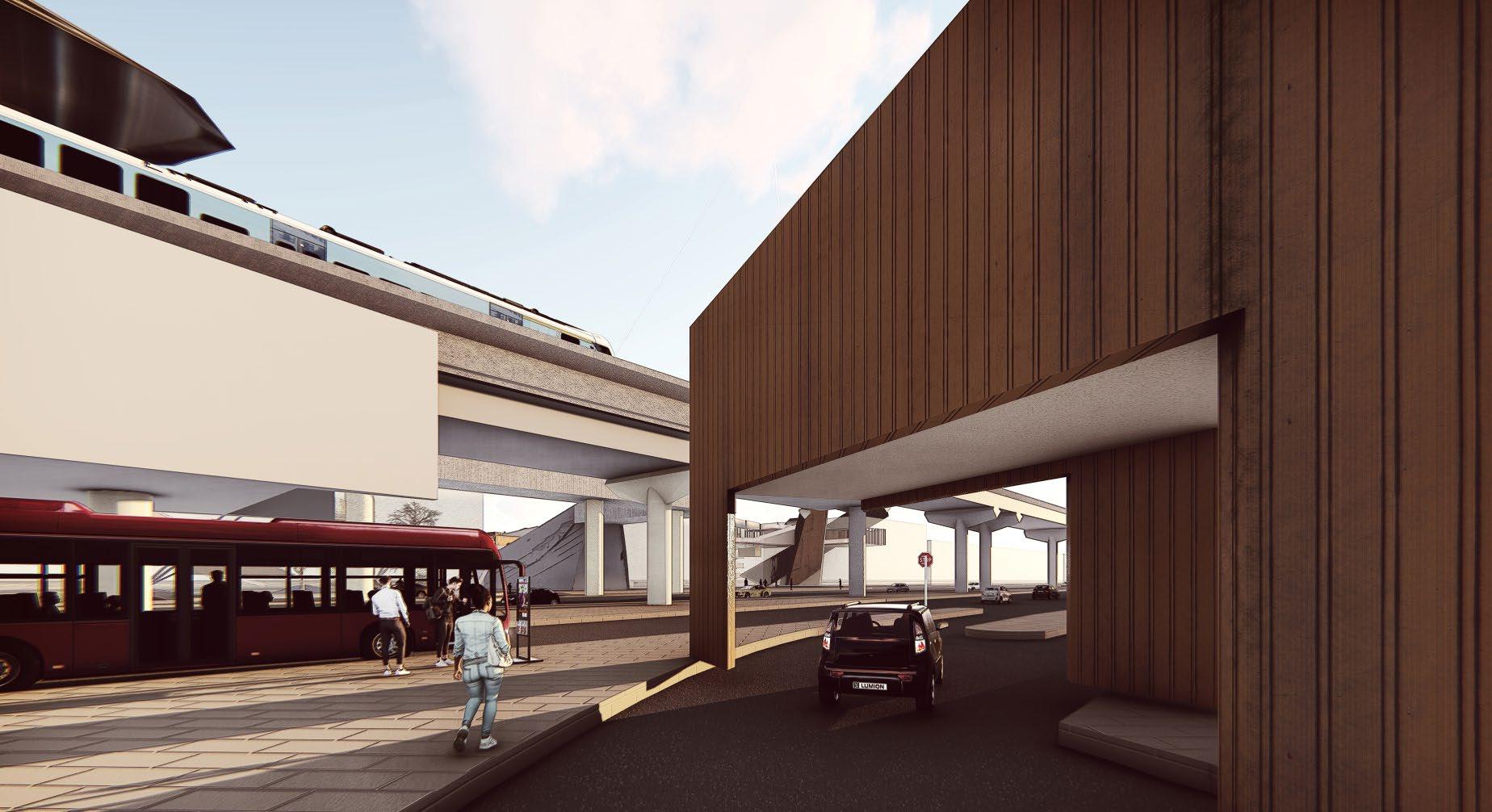 Looking at the metro through the deck under the shade of spark and the existing building.