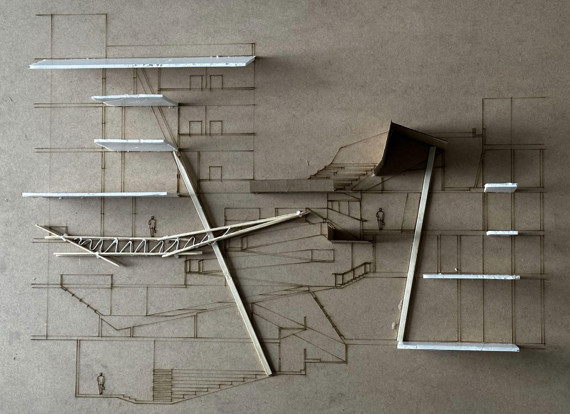 The sectional model depicts the relationship between the existing and new, as well as the structural behaviour of truss system, additional columns and slabs.