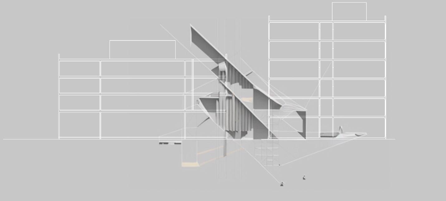 Dominating the building through different levels and planes following the inert spread of grid from the points A and B, creating a sloping planes structure.