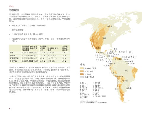 全球20亿旱地人口大多分布在发展中国家。绝大多数人口生活在贫困线 以下,没有充足的清洁水源。旱地占地球表面的41.3%,全球耕地总面 积的44%都分布在旱地。旱地拥有全球近一半的可耕地,供养着全世界 50%的牲畜,也是重要的野生动物栖息地。 由于气候条件严酷,旱地孕 育了极其丰富多样的特有种适应环境特定的环境.这种生物多样性对保 持生态平衡和保护人类生计极为重要。相对来说,大量的本地特有物种 是生活在沙地、森林和林地、热带草原、湿地、池塘、湖泊和河流这些 栖息地。