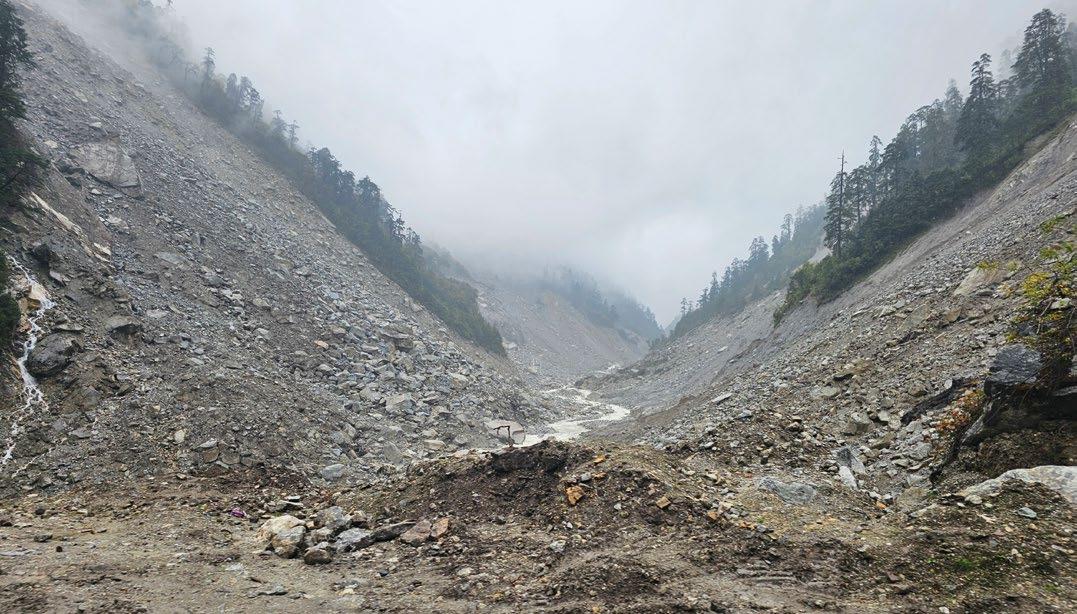 Zemu Valley above Lachen before (left) and after (right) the GLOF (Photos: GEOTEST, 2023 and 2024)