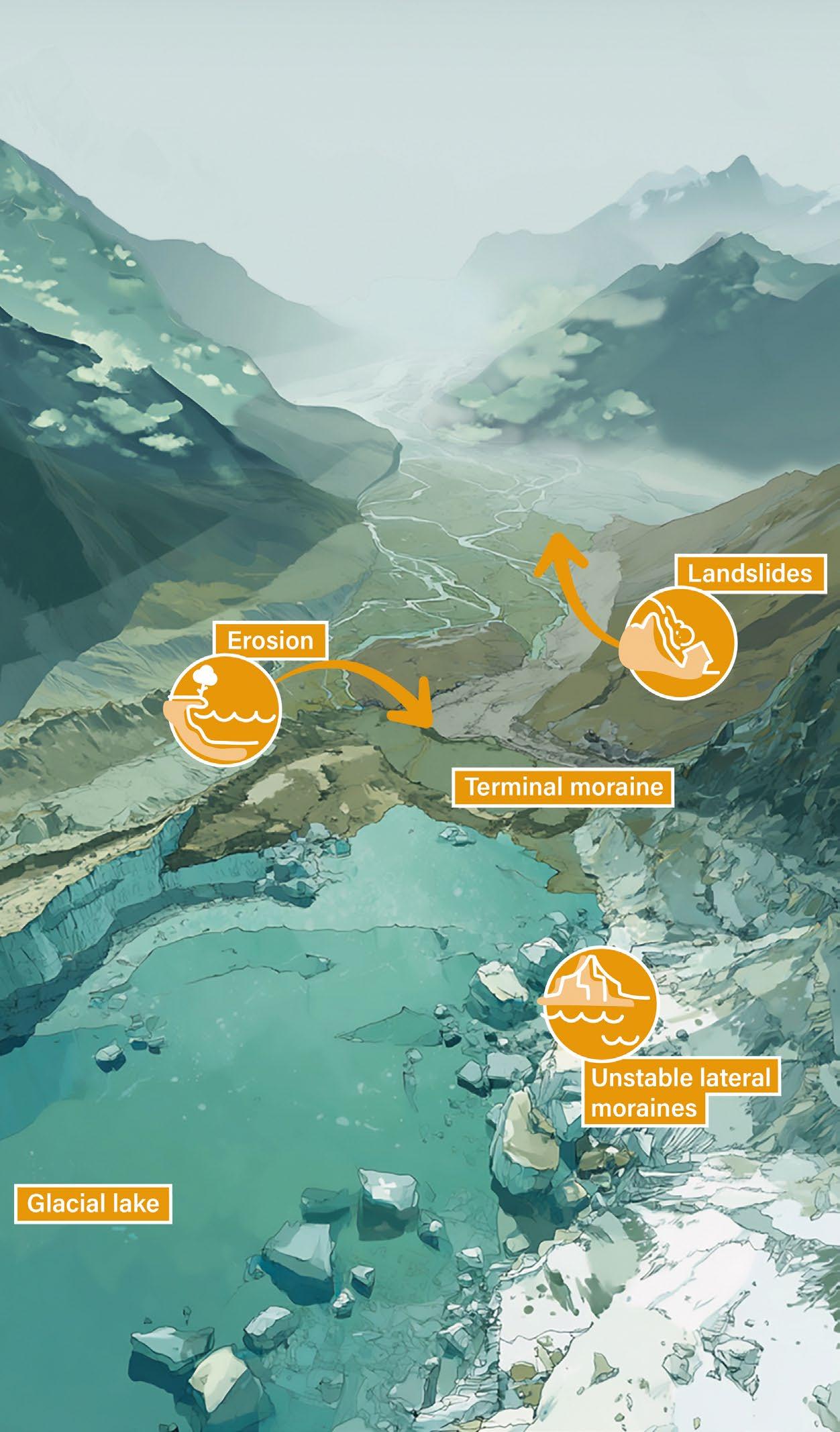 Glacial Lake Outburst Flood triggers and local impacts (Illustration produced by Zoï Environment Network, 2025)