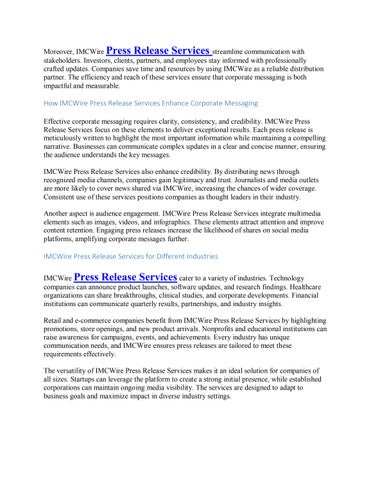 Another aspect is audience engagement. IMCWire Press Release Services integrate multimedia elements such as images, videos, and infographics. These elements attract attention and improve content retention. Engaging press releases increase the likelihood of shares on social media platforms, amplifying corporate messages further.