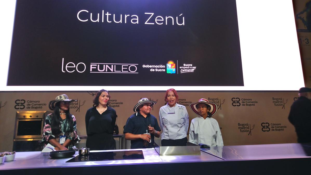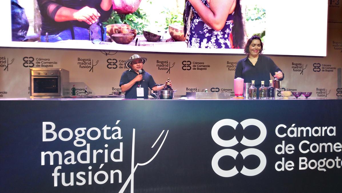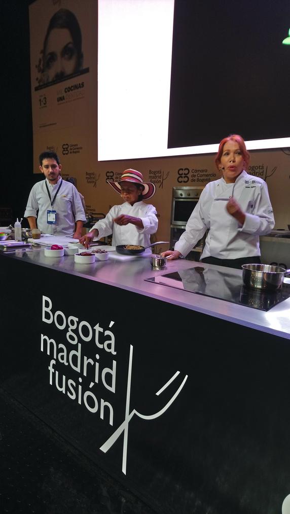 El segundo día de Bogotá Madrid Fusión arrancó cargado de cultura colombiana con la presentación de la mejor Chef del Mundo Femenina, Leonor Espinosa y su hija, la Sommelier Laura Hernández, quienes ambientaron el escenario con gaitas y maracas propias de la cultura Zenú, mientras lideresas comunitarias del departamento de Sucre narraban la tradición culinaria de la región. Una receta con hongos silvestres y berenjenas de tierras palenqueras fue lo que preparó Dominga Estrada.