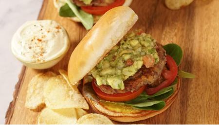 Zona Gastronómica Usaquén | 58 1 taza de fríjol bola roja 1/2 cebolla picada 3 dientes de ajo 1 puñado de cilantro 1 huevo 1/2 cucharadita de comino Sal y pimienta al gusto Pan para hamburguesa Mostaza al gusto Rodajas de tomate 1 puñado de mézclum Guacamole Ingredientes