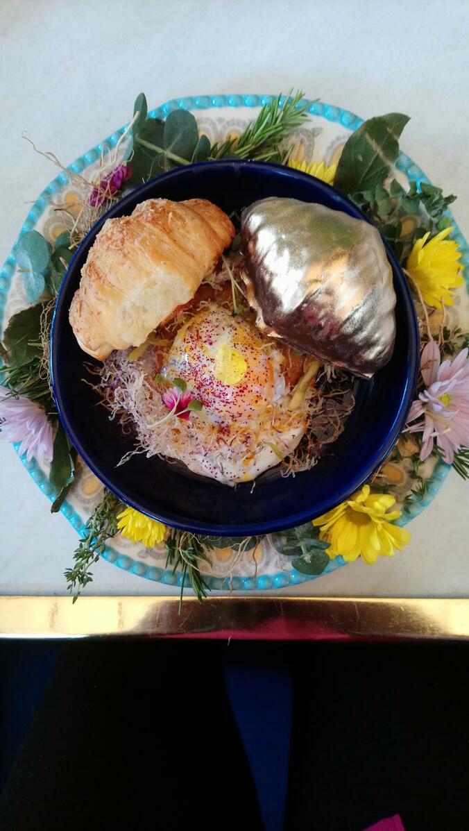 Foto: Brunch / Arepa de maíz, rellena de ragú, huevo cocido a baja temperatura, espuma de balú, habas crocantes y aceite de trufa, croissant.