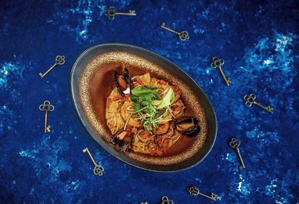Su propuesta gastronómica es muy diversa, incluye Alaskan King Crab, Cangrejo Azul y platos con nombres exóticos como: ‘Y no quedaron ni los huesos’ : esqueleto de pescado con mariscos apanados; o ‘Yo también me baño’ , mezcla de mariscos en crema tandoori y con aire de cebollín y rúgula, entre otros.