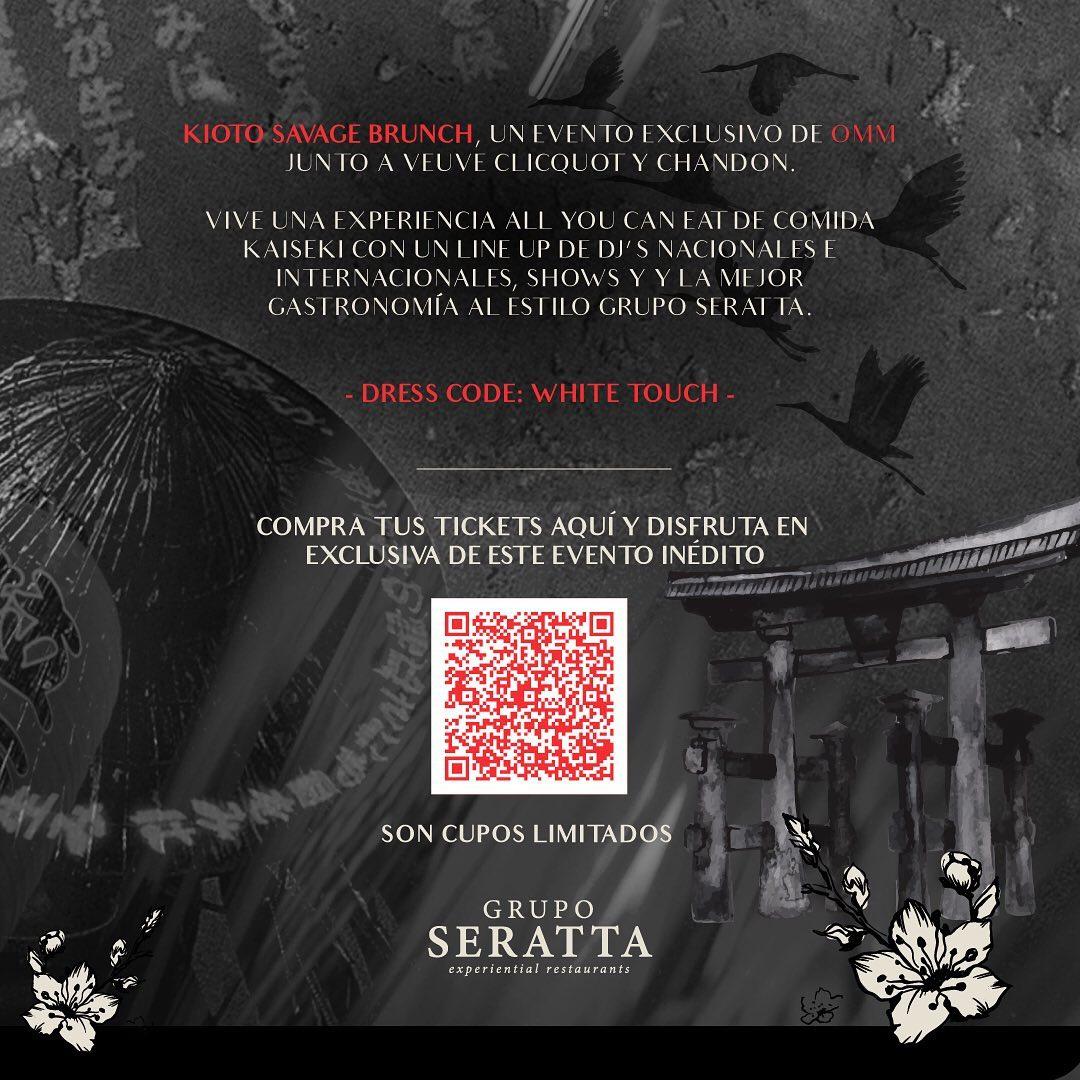 ¡¡AGENDATE!! No te pierdas la oportunidad de asistir al primer evento asiático exclusivo del año "Kioto Brunch" del Restaurante OMM junto a Veuve Clicquot y Chandon, este 22 de abril en el que vivirás una experiencia All You Can Eat de comida Kaiseki con un Line up de Dj´s nacionales e internacionales, shows y la mejor gastronomía asiática al estilo del Grupo Seratta, donde podrás pasar momentos a otro nivel desde las 9:00 am a 2:00 am, ubicados en Autopista Nte. #114 -44. Tickets en Primera Etapa hasta el 12 de abril por un costo de $ 149.900,00 lo puedes comprar a través de www.restauranteseratta.com/eventos