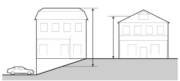 i. Building height is measured as the distance between a horizontal line at the average grade directly beside the structure and the highest point of any of the following, as applicable: (1) the coping of a flat roof; (2) the top of a mansard roof; (3) the midpoint of any pitched gable, hip or the upper portion of a gambrel roof; or (4) as measured between the top floor ceiling and the peak of the roof on an “A” framed structure.
