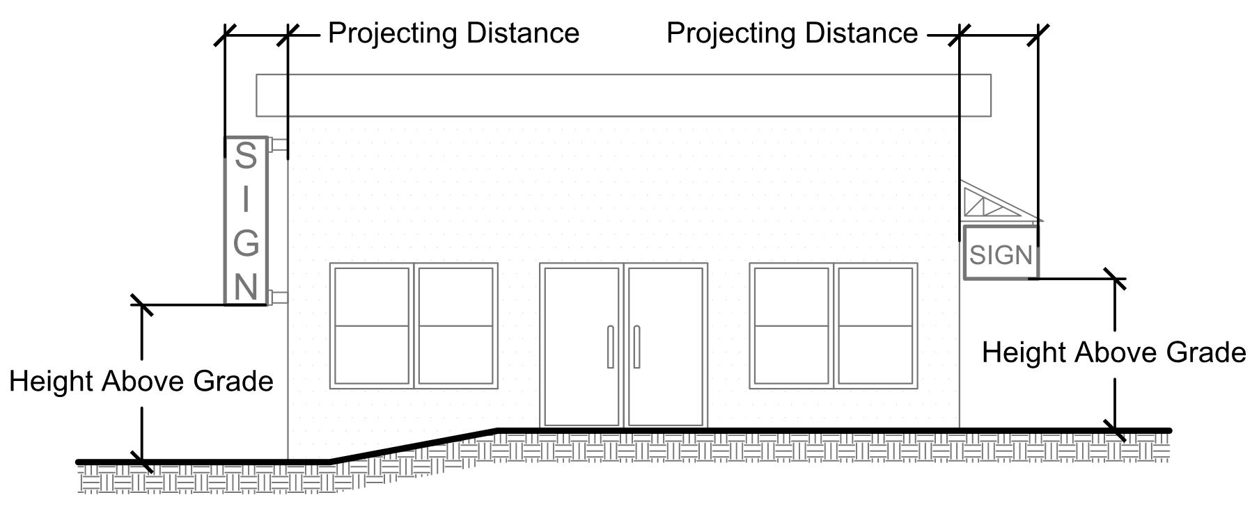 (5) Sign: Blade Sign. A single-faced or double-faced building sign attached to and projecting from the façade of a building or a supporting column, generally at a right angle to the building wall or column.