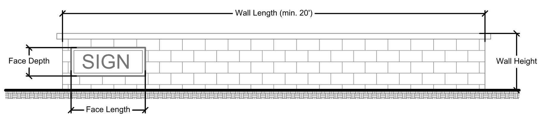 (36) Sign: Wall Sign. Any sign, including a painted wall sign, that is attached to a freestanding wall that is not part of a building. For the purposes of this definition, such a freestanding wall must be at least twenty (20) feet long for a sign placed upon it to qualify as a wall sign, as shown in Figure 24-62: Example Wall Sign A sign attached to a wall that is less than twenty (20) feet in length shall be defined as a Monument Sign if the wall base touches the ground, or as a Freestanding Sign if the wall base does not touch the ground.