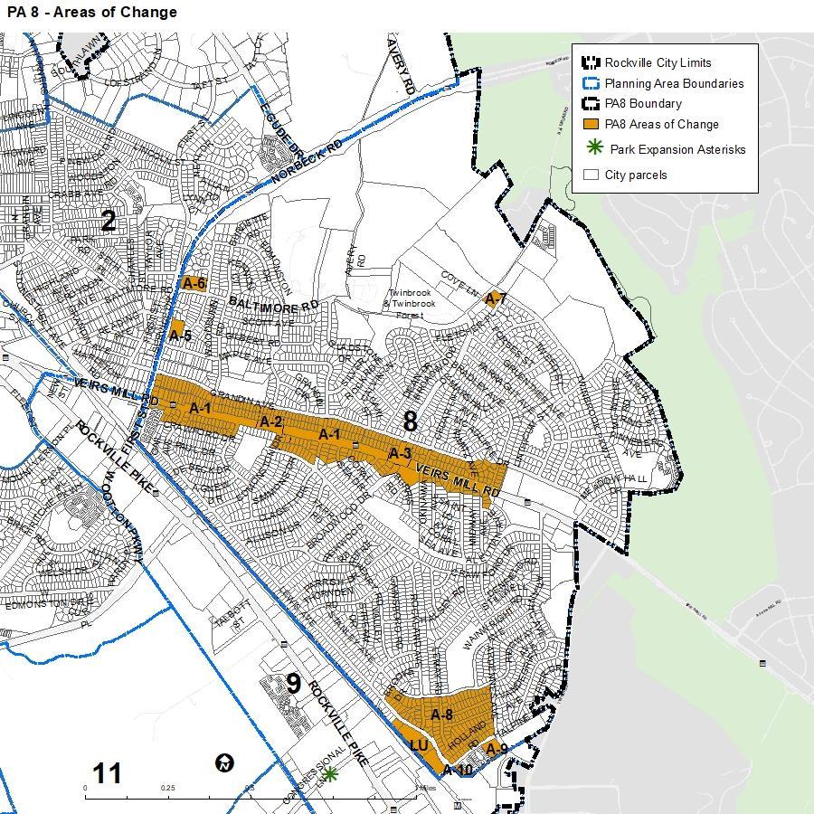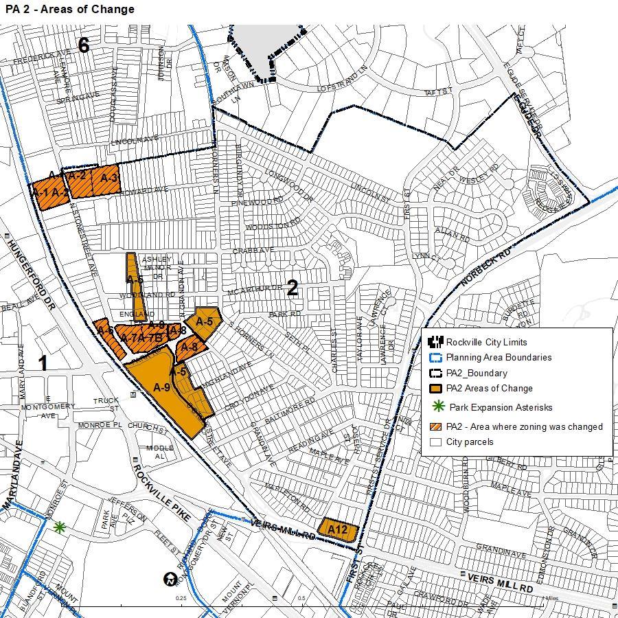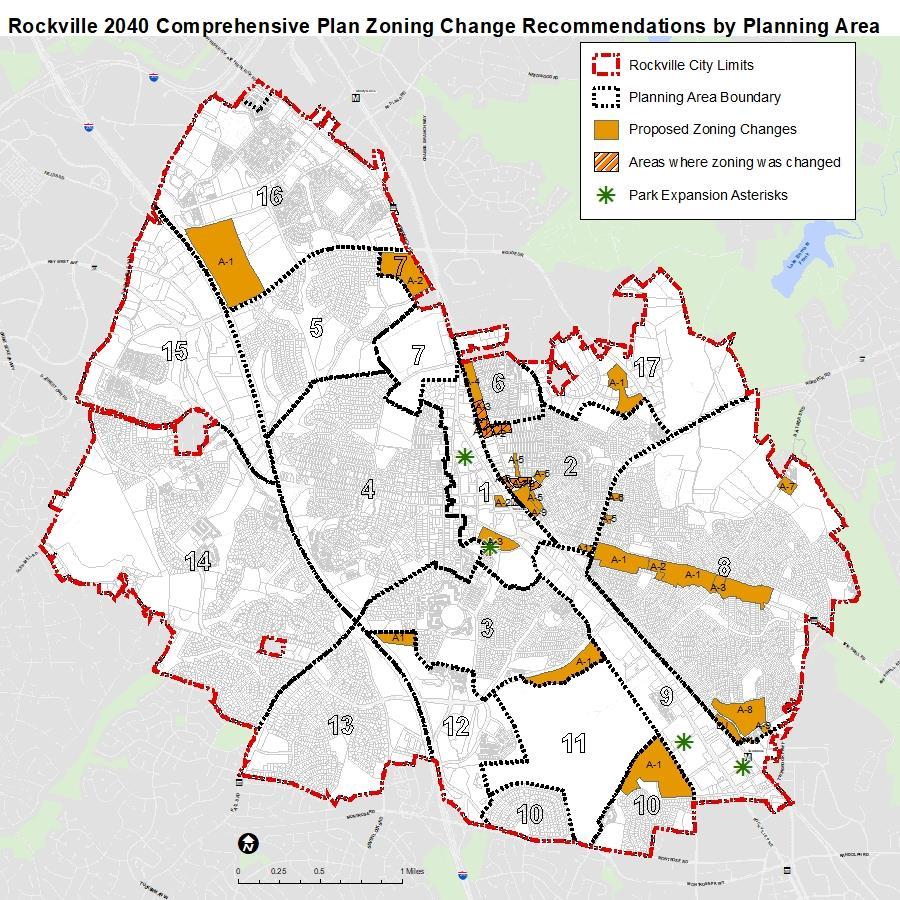 Given that many of the more granular recommendations from the Comprehensive Plan apply to the 17 Planning Areas, the analysis of zoning districts has been broken out by Planning Area for ease of review. Utilizing the planning areas provides a unit of organization for the extensive land use recommendations contained within the Comprehensive Plan. Contrary to many comprehensive plans, the zoning recommendations within Rockville 2040 are highly specific. Usually, Diagnostic Reports must build the nexus between general land use goals and how they should apply to zoning text or standards. In contrast, in Rockville 2040, zoning recommendations are specific, and apply to highly specific areas.