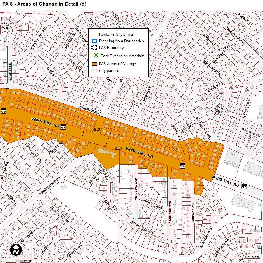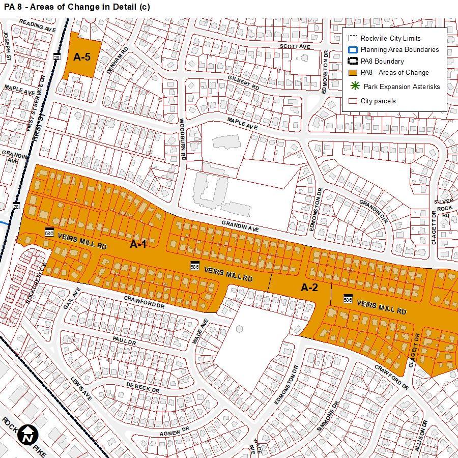 • Transitions Between Differential Scales and Uses. Maintaining appropriate transitions between both varying uses and varying scales is mentioned throughout Rockville 2040 and in almost every Planning Area. Approaches to ensuring sensitive transitions between higher density development and single detached neighborhoods, while balancing Comprehensive Plan policies regarding intense development around Metro and BRT stations, will need to be evaluated during the Calibration Module.