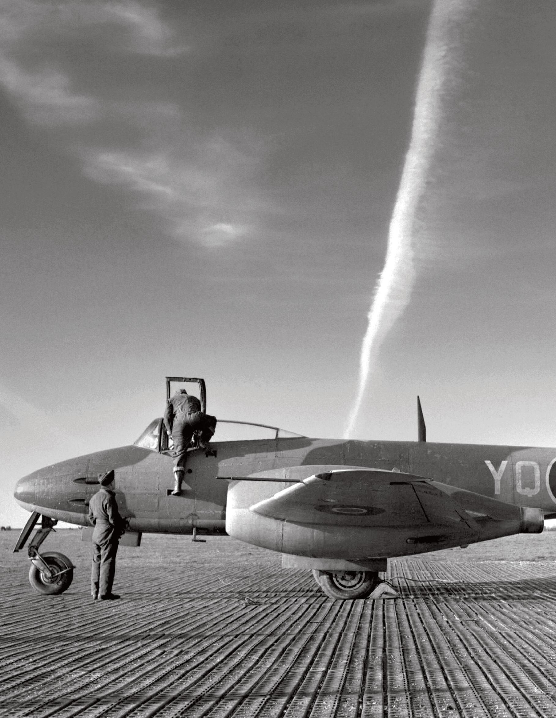Gloster Meteor, první britská proudová stíhačka a jediné proudové letadlo spojeneckých sil, které zasáhlo do druhé světové války, byl zařazen do služby u 616. perutě v červenci 1944. Tento stroj čísla EE227, vyfotografovaný v lednu 1945 v kentském Manstonu, později dostal turbovrtulové motory Rolls-Royce Trent