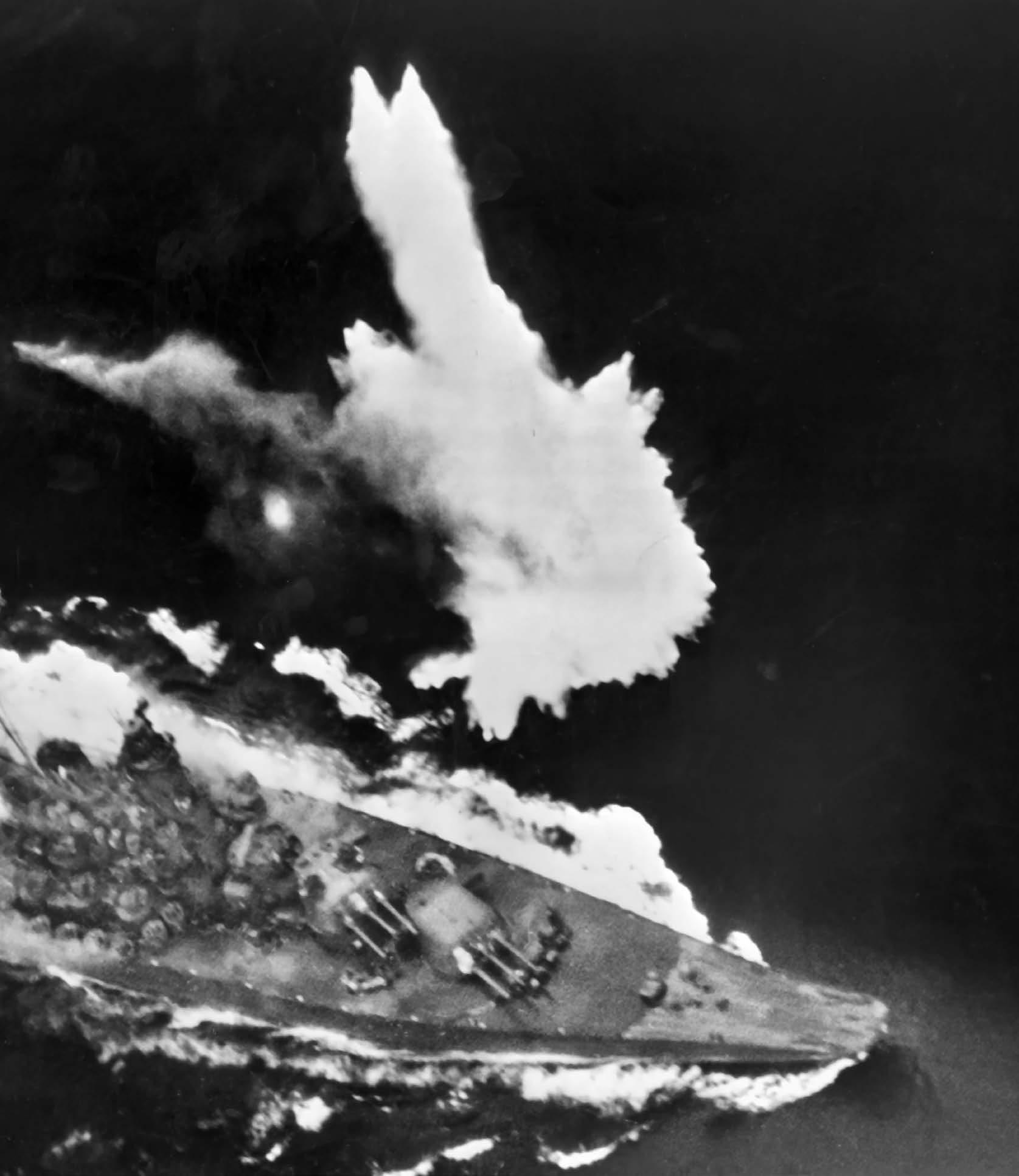 Jamato krátce před svým potopením kličkuje mezi dopadajícími pumami amerických bombardérů. Zadní část nástavby již hoří