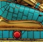 s hlavou lvice Bastet byla také bohyní bas neboli nádoby na mast, a stejně jako mast působila léčivou silou. Někdy byla zobrazována s hlavou lvice namísto kočky, jako na tomto zlatém přívěsku z doby vlády Pasbachaenniuta I. (21. dynastie).