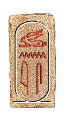 Pečeť ve tvaru skaraba Podobné pečeti, obvykle zdobené vzory a nápisy, se někdy používaly k ověřování úředních dokumentů. Tento exemplář nese kartuši Thutmose I. s jeho trůnním jménem, kterou po stranách lemují hlavy dvou sokolů a na které stojí okřídlený skarab.