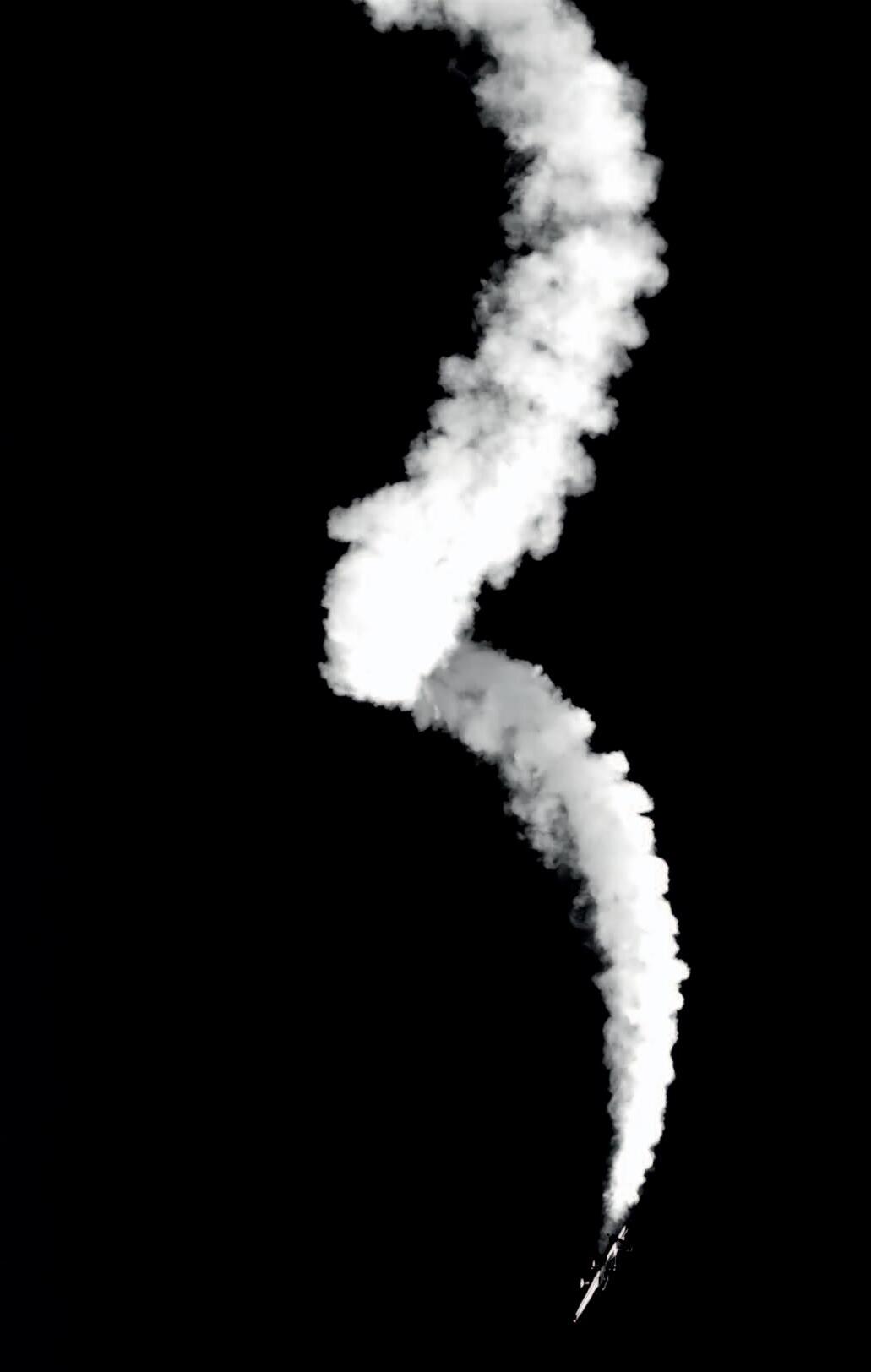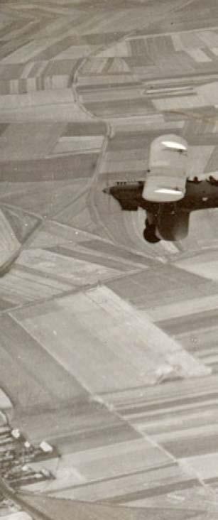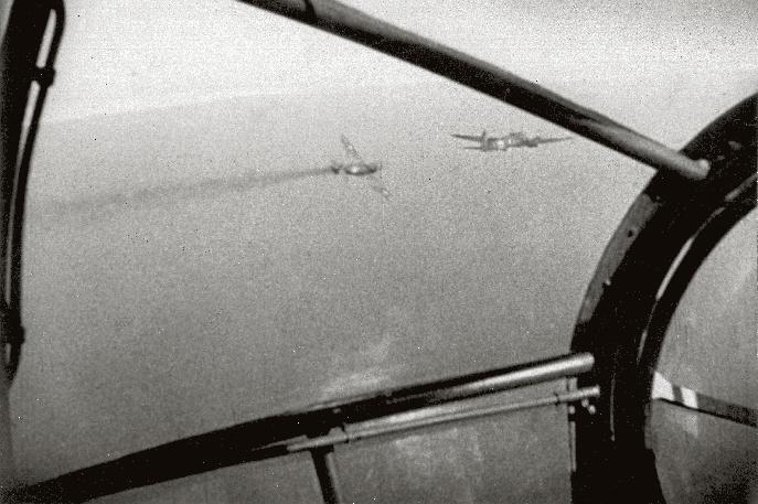 Zasažený Spitfire na snímku pořízeném z prosklené přídě německého bombardéru