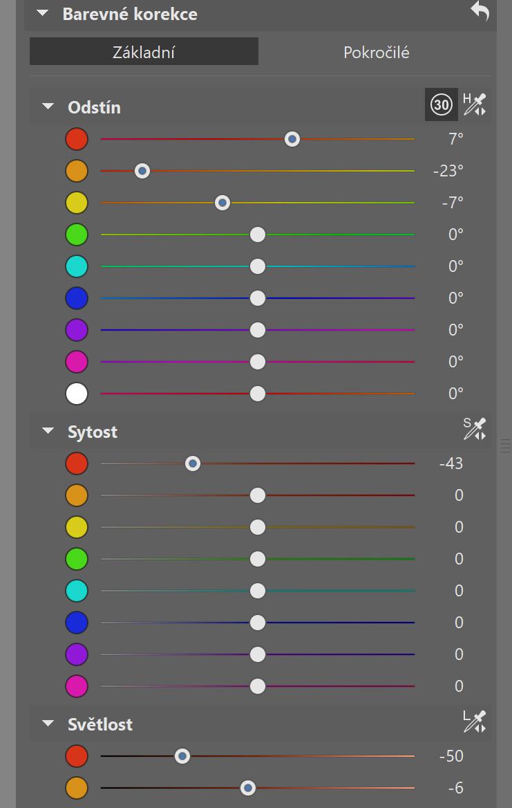 V sekci Barevné korekce pak najděte danou barvu, v tomto případě oranžovou, a Odstín posuňte podle potřeby. Při posunu odstínu například z oranžové na červenou může dojít k tomu, že výsledná barva bude příliš světlá a sytá. Snížením Sytosti a Světlosti tento jev eliminujete, aby výsledek byl tak akorát.