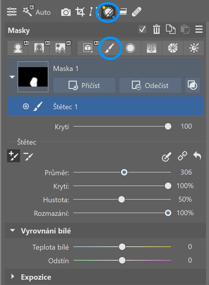 Změnu barvy je tedy potřeba udělat lokálně. Stačí vybrat nástroj Štětec (B) a zamalovat zhruba konkrétní část fotky.
