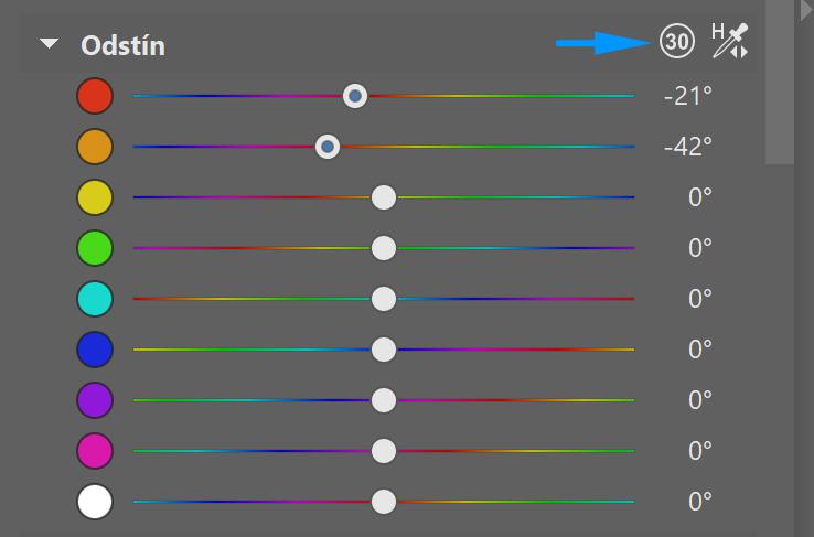 Pokud se vám zdá, že barvu potřebujete posunout ještě dál, než končí posuvník, klikněte na ikonu s číslem 30, která zruší omezení a barvy pak posunete úplně jakkoliv. Omezení brání vzniku nežádoucích artefaktů při příliš drastických posunech barev. Ale pokud potřebujete výraznou úpravu, máte tu možnost.