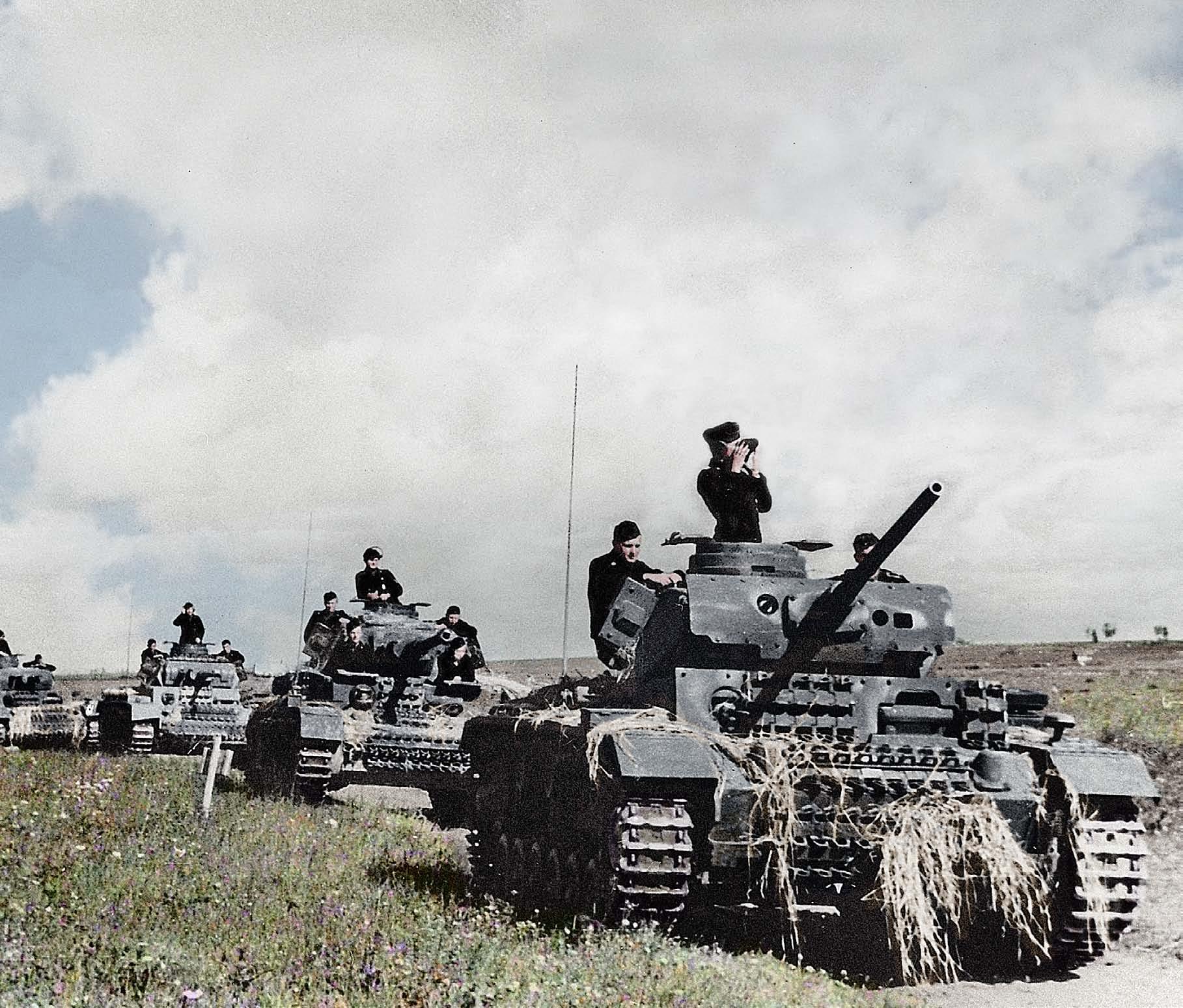 Střední tank PzKpfw III s doprovodnou pěchotou zachycený během Rommelova vpádu do Egypta. Vojska Osy tehdy hnala poraženou 8. armádu od Gazaly a Tobruku.
